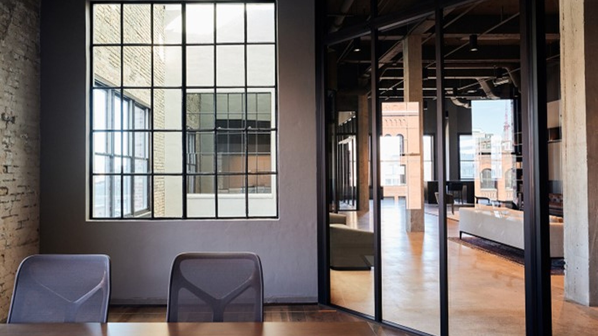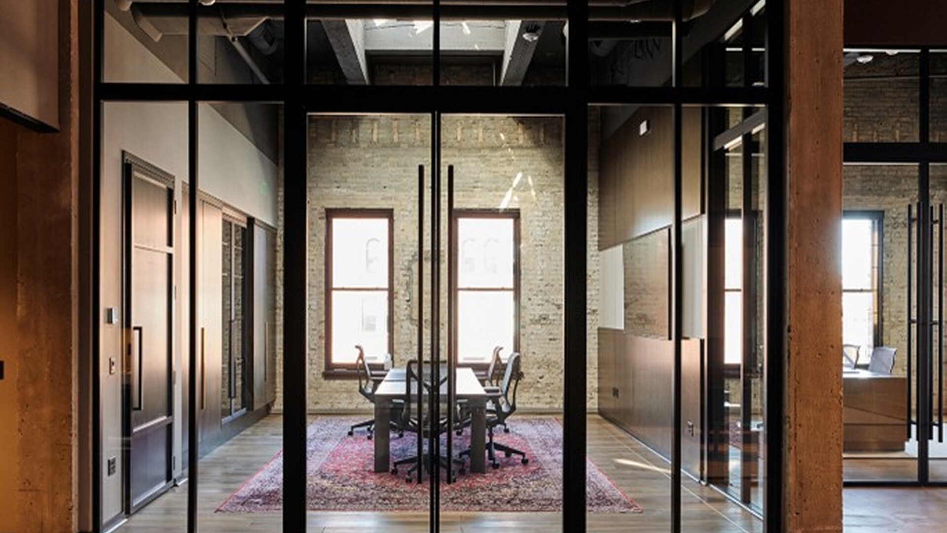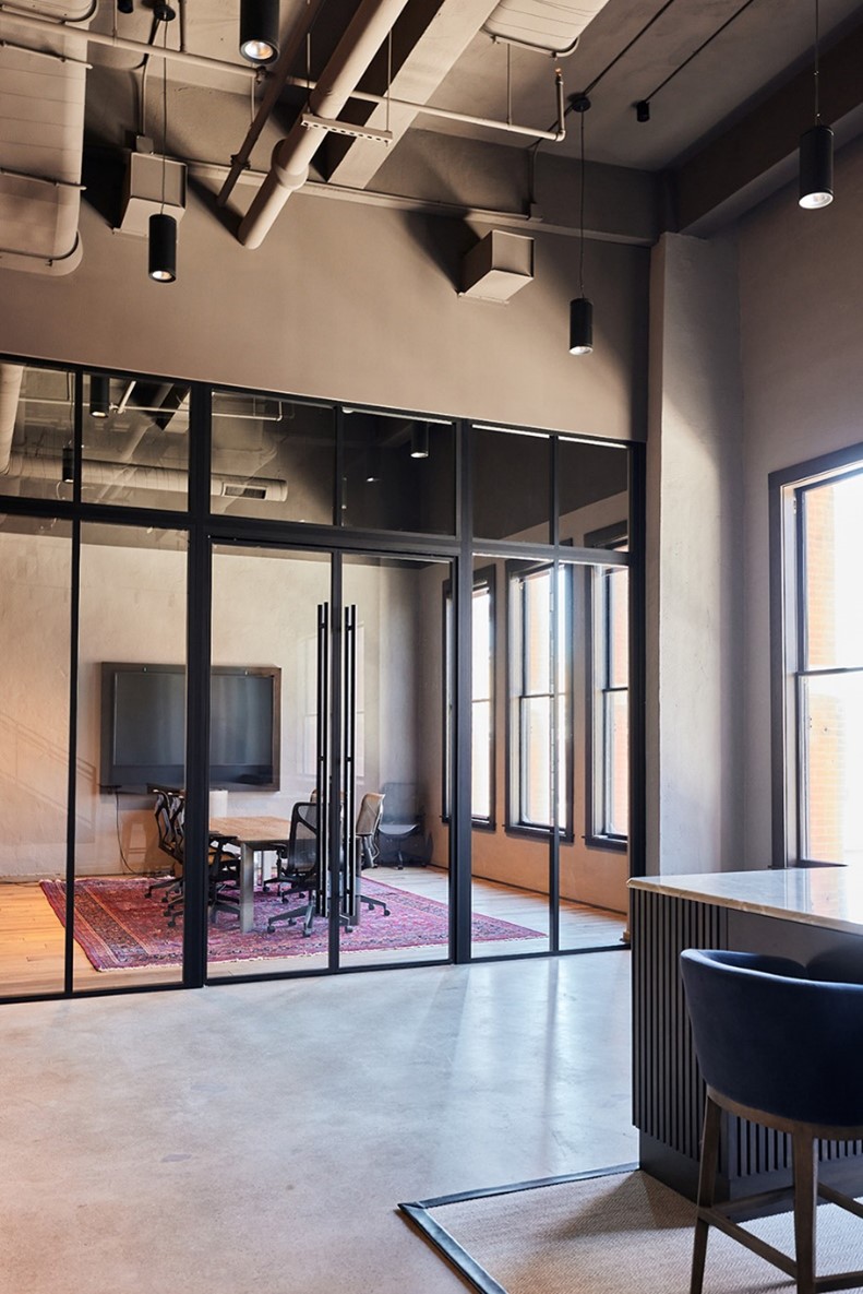 Moving away from clears and silvers, this firm has opted for a deep black anodized finish to highlight their office’s existing architectural space.