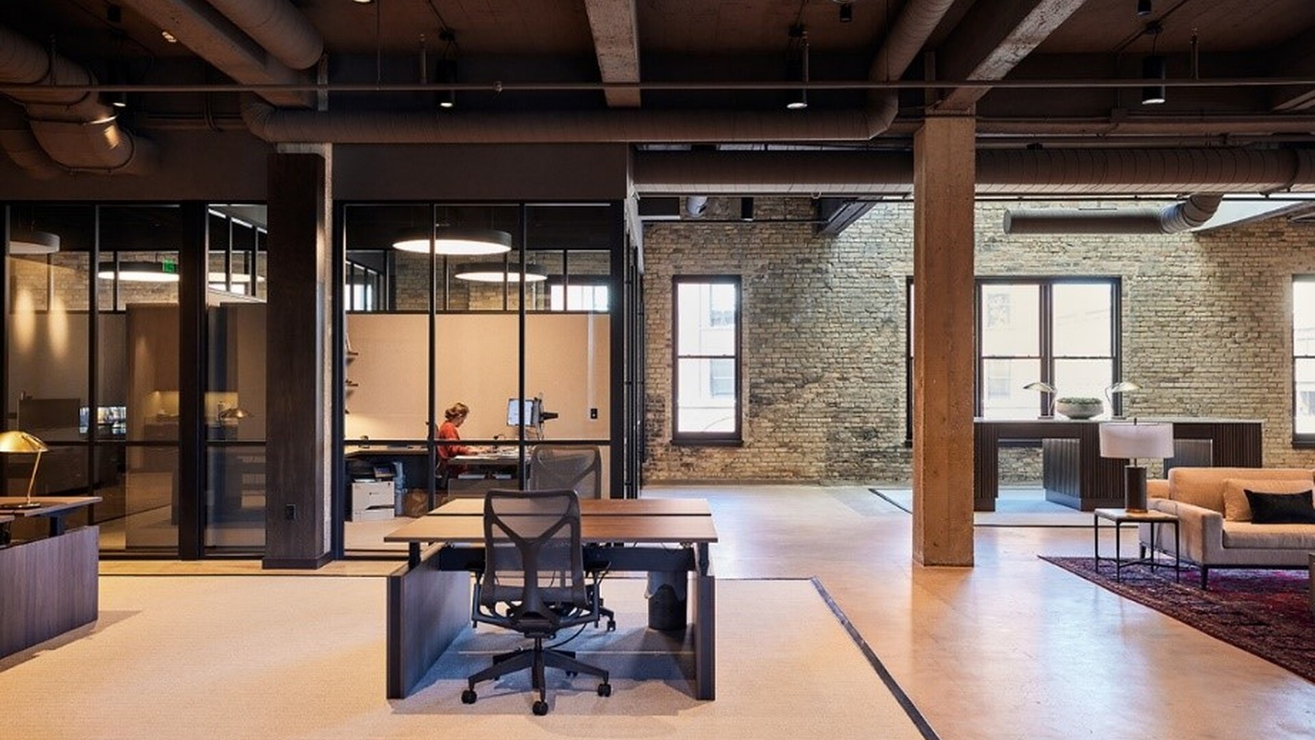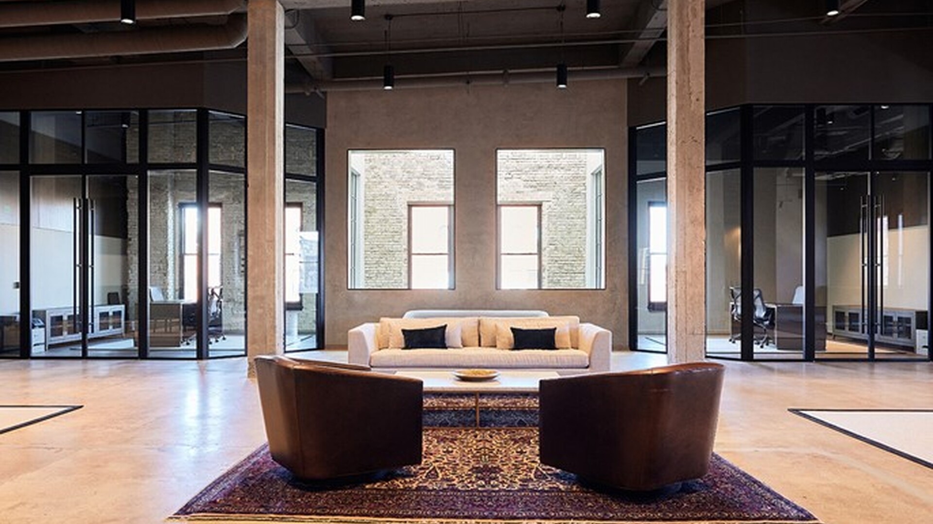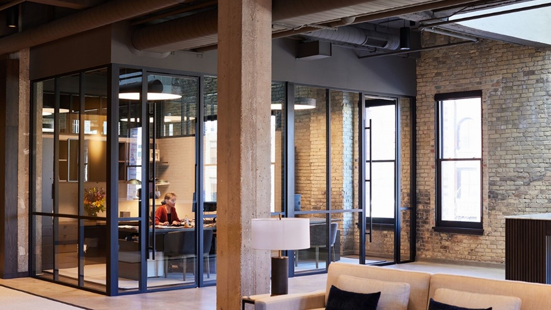 Moving away from clears and silvers, this firm has opted for a deep black anodized finish to highlight their office’s existing architectural space.