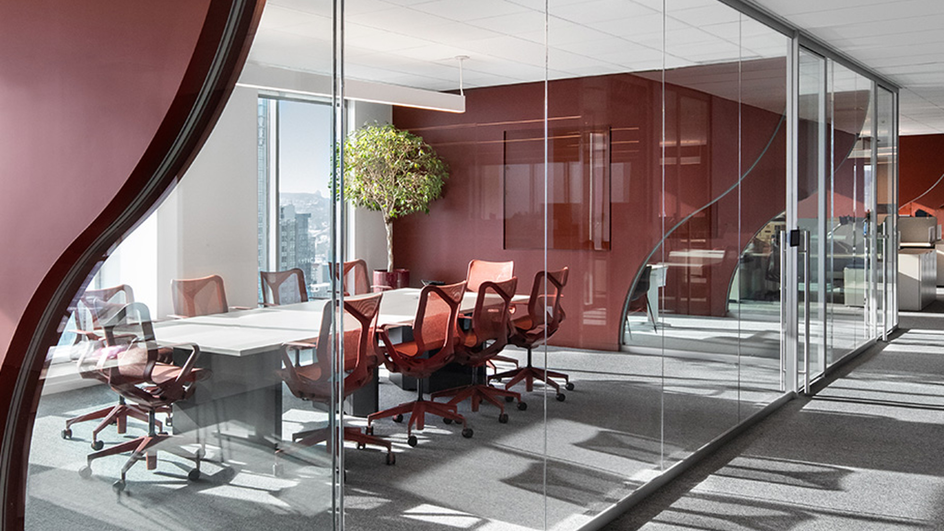 A clear anodized finish has been chosen here to complement the swirling bordeaux walls between each room. The FINO between the office spaces is double glazed to improve acoustics, while simultaneously providing both privacy and collaboration.