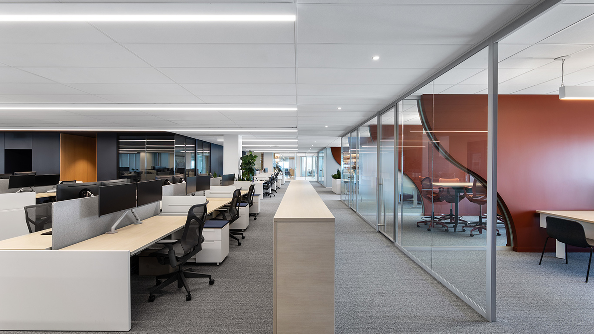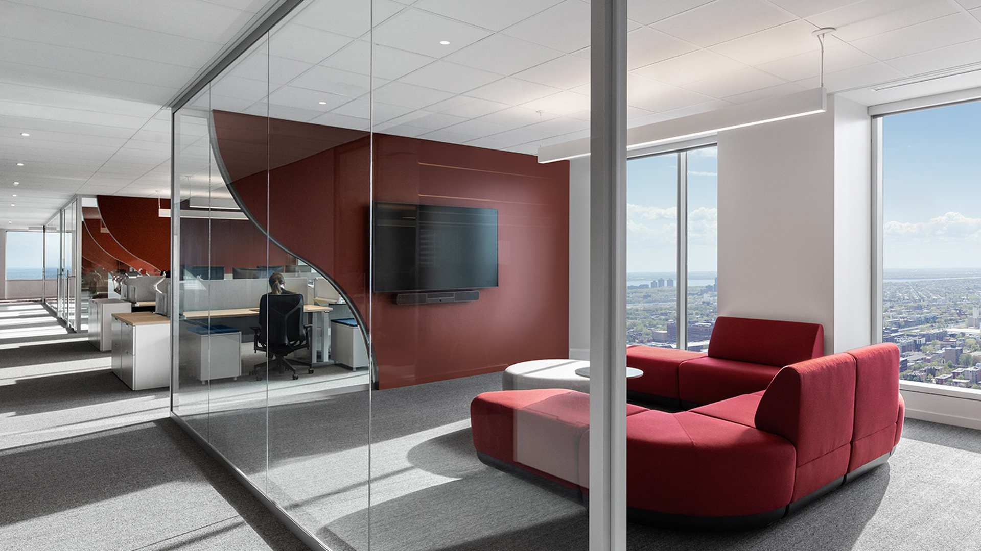 While the glazing along this wall is clear, the walls behind them are blue, making it look as if the glass itself is tinted. They’ve made use of the transparency of glass without selecting the specialty option. In this way, we see a deep blue from the exterior, whereas once inside the room we enjoy the standard, healthy sunlight as we know it. Additionally, the carpet and ceiling are stitched and painted blue to give the illusion of curved glass. The black anodized finish adds a seamless finishing touch. This clever design catches the eye and makes for a rich contrast against the lighter colors of the open office plan.