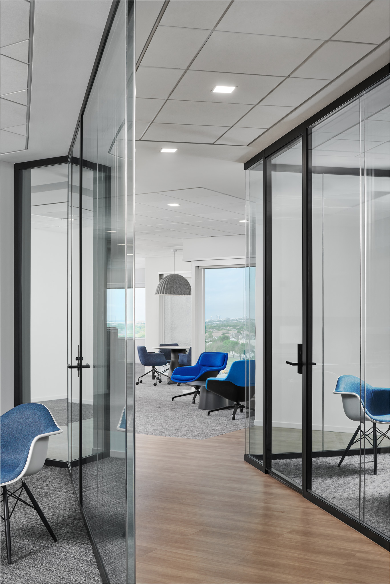 Les murs FINO créent un mélange parfait de collaboration et d’intimité, tout en augmentant le passage de’ la lumière naturelle. Dans cet exemple, les salles de réunion n’ont qu’un accès minimal les unes aux autres, tandis que le bureau lui-même peut bénéficier de la lumière naturelle qui passe sous de multiples angles.