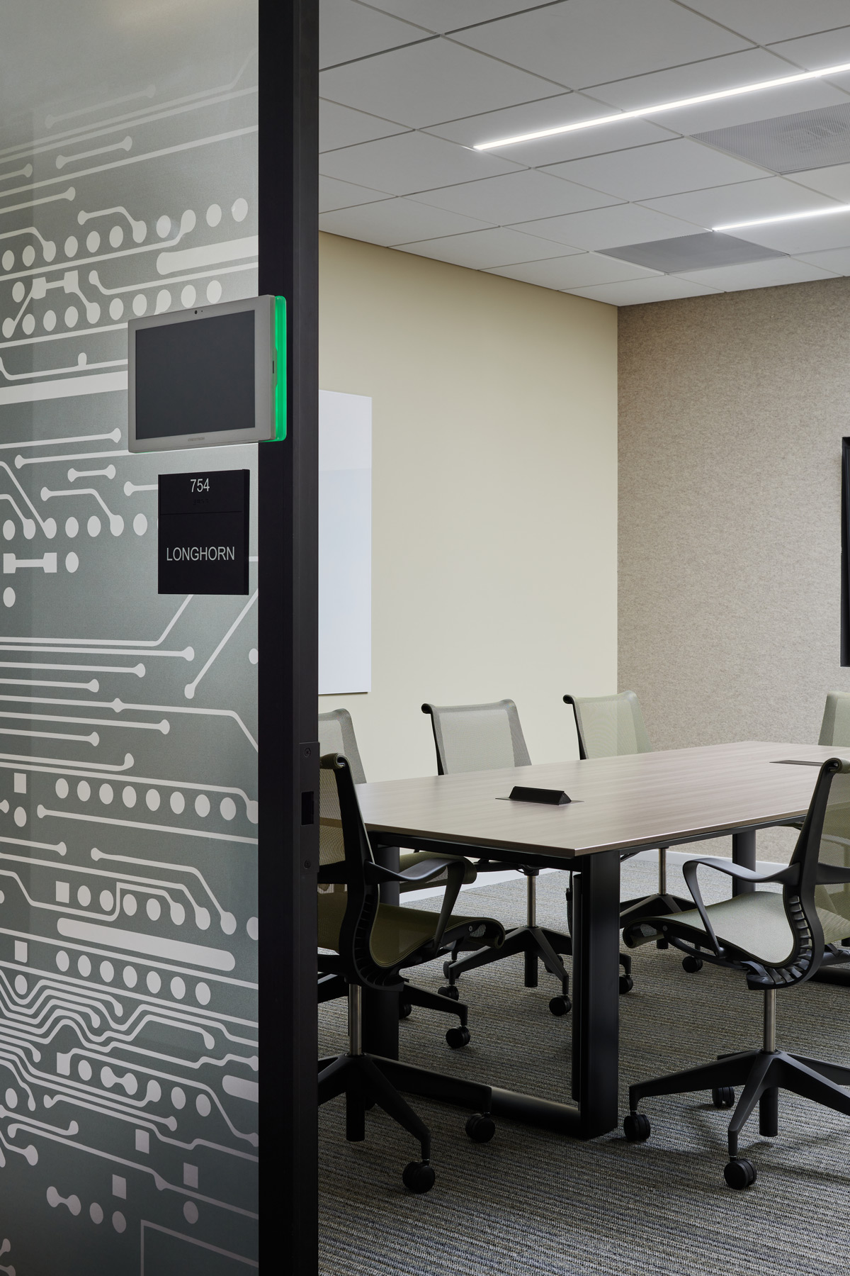 Le cabinet a choisi d’ajouter une touche personnalisée de technologie à des endroits précis. Ce mur en verre affiche la marque de leur entreprise. Les personnes responsables des horaires pour les salles permettent au personnel de réserver la salle de réunion de leur choix bien à l’avance.