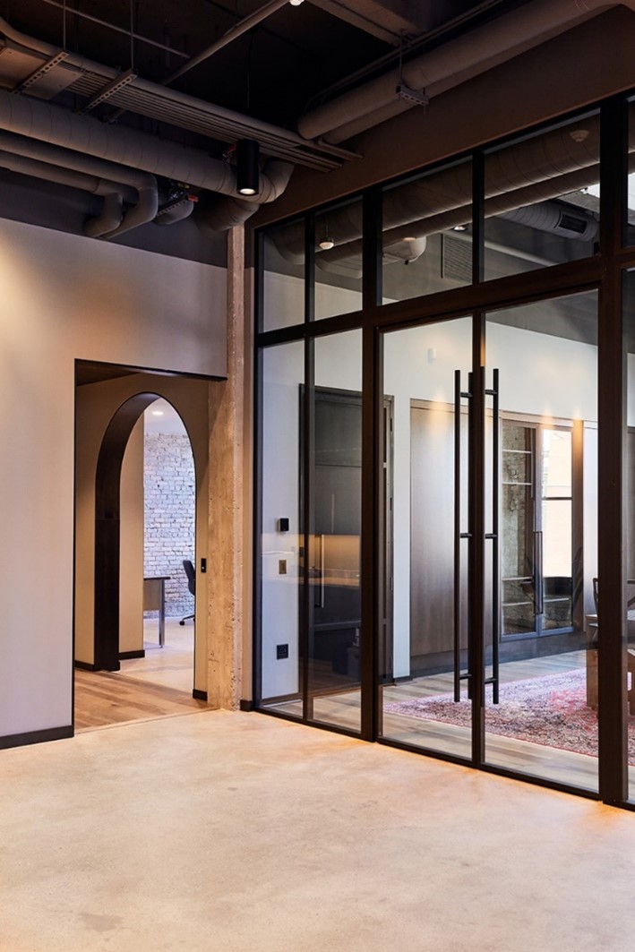 S’éloignant des teintes claires et argentées, cette société a opté pour une finition anodisée d’un noir profond afin de mettre en valeur l’espace architectural existant de son bureau.