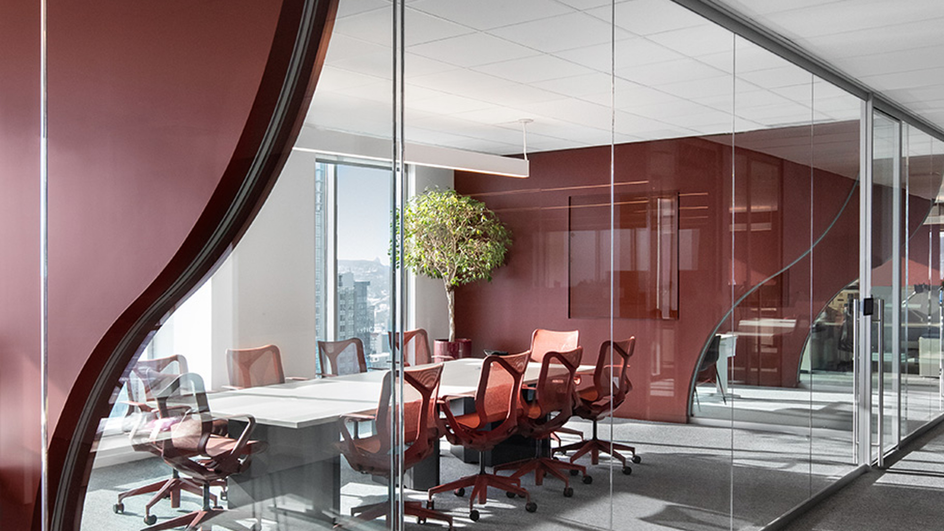 Le verre de ce mur est transparent, mais les murs derrière lui sont bleus, ce qui donne l’impression que c’est le verre lui-même qui est teinté. On a utilisé la transparence du verre sans nécessairement opter pour un verre spécial. De cette manière, nous voyons un bleu profond de l’extérieur, mais, une fois à l’intérieur de la pièce, nous profitons de la revigorante lumière naturelle du soleil. De plus, le tapis et le plafond de couleur bleue donnent l’illusion que le verre est bombé. Le fini anodisé noir ajoute une touche finale sans faille. Cette conception intelligente attire l’attention et crée un riche contraste avec les couleurs plus claires de l’aménagement du bureau ouvert.
