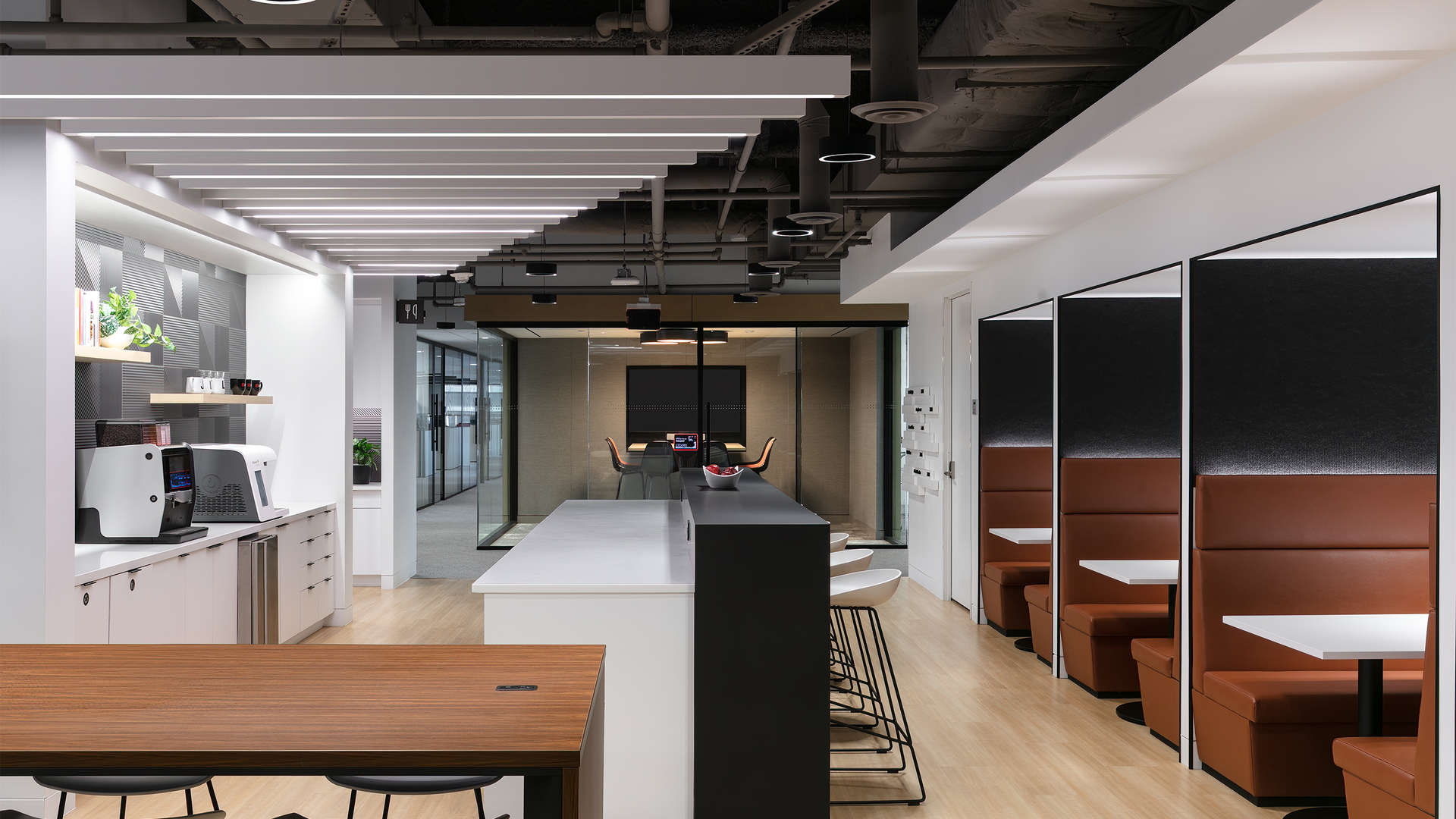 Sous cet angle, nous pouvons constater que les murs MIMO sont utilisés d’une manière qui dégage chaleur et professionnalisme. L’agencement des meubles et le choix du bois pour les portes confèrent un esprit de convivialité, tandis que les mullions des murs MIMO et le travail des programmateurs d’espace indiquent clairement qu’il s’agit d’un espace de travail.