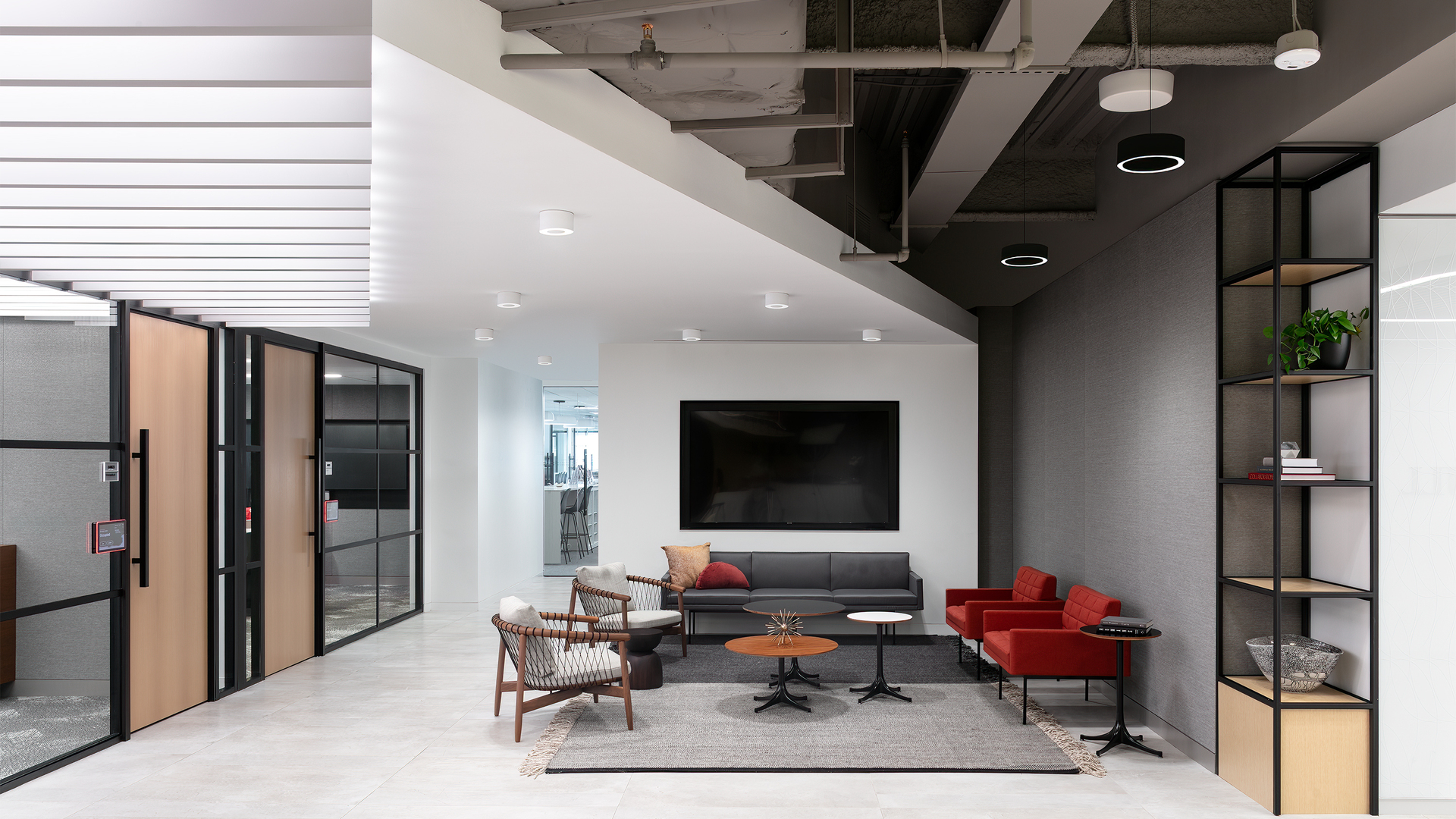 MIMO is in the center and the firm has chosen two wooden doors on both its sides, bringing about a sense of symmetry. The mullions for this MIMO capture the gaze, thus highlighting the board room. The black powdercoat finish creates a smooth contrast with the white overhead ceiling bars.
