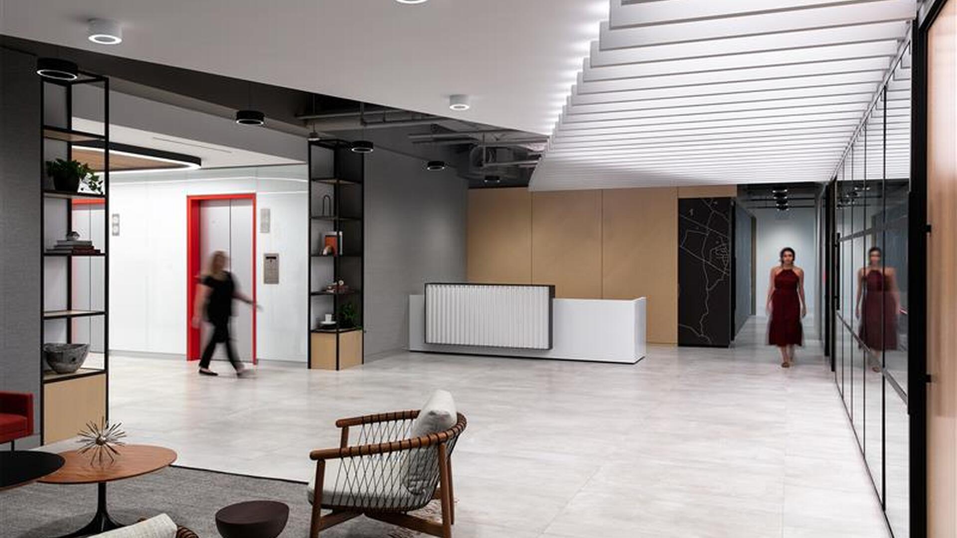 Every detail is carefully and thoughtfully selected. The black powder coat finishes complement the black marble wall as well as the shelves to the side, while the wooden doors match the wall behind the reception as well as the base of the shelves. The grey and earth tones of the furniture bring about an aesthetic balance to the space. The reflective quality of these glazed walls brings a silvery, minimal touch to this hallway.