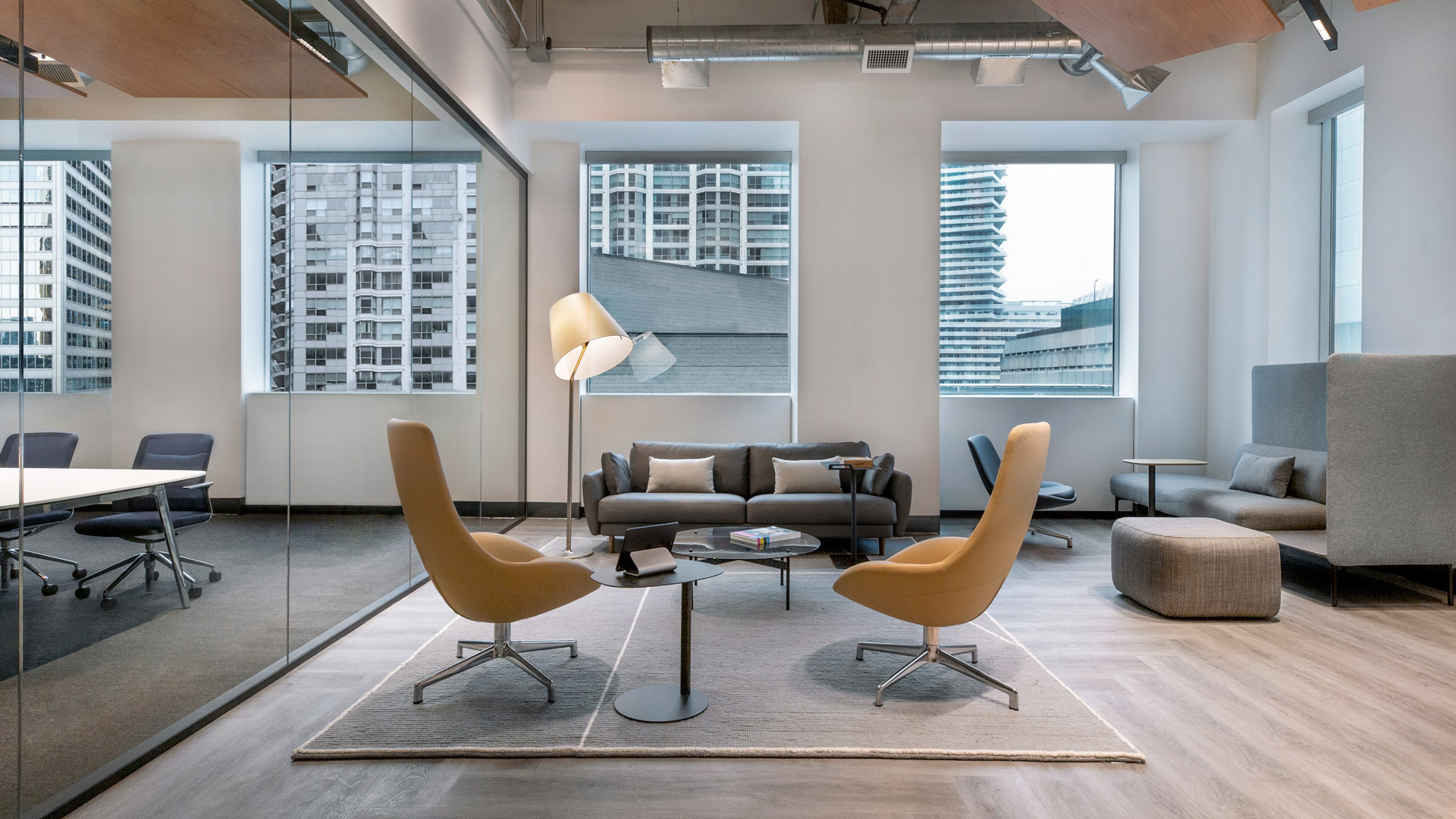 This expansive MIMO below brings a sense of merging between the public sitting area and the meeting room. The unobstructed passage of natural light, reinforced by the reflection of the visible high-rises, creates an open, calming effect for anyone experiencing this waiting room area. We once again see how both offices have chosen similar brands of furniture, maintaining a sense of uniformity and familiarity.