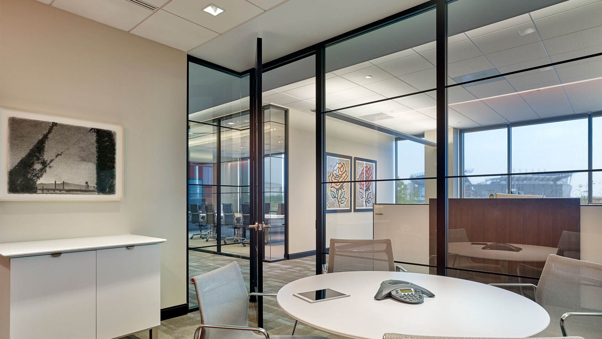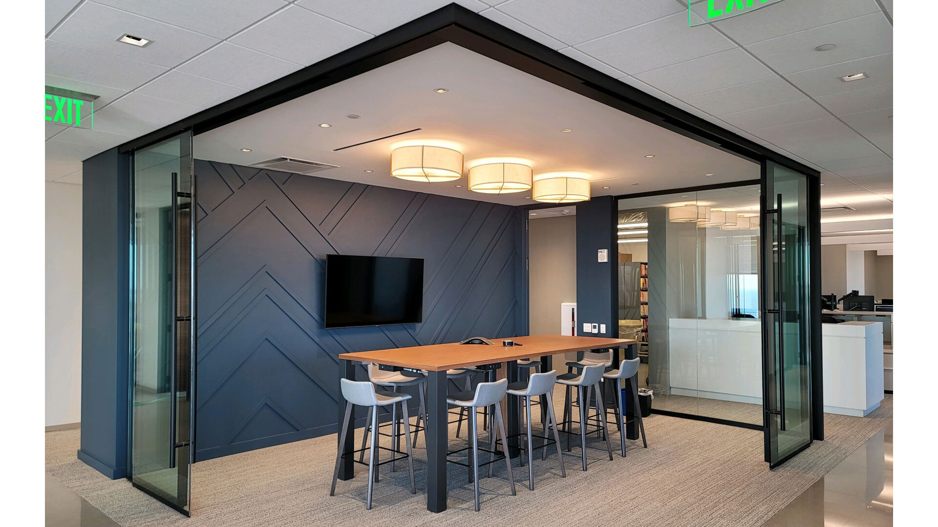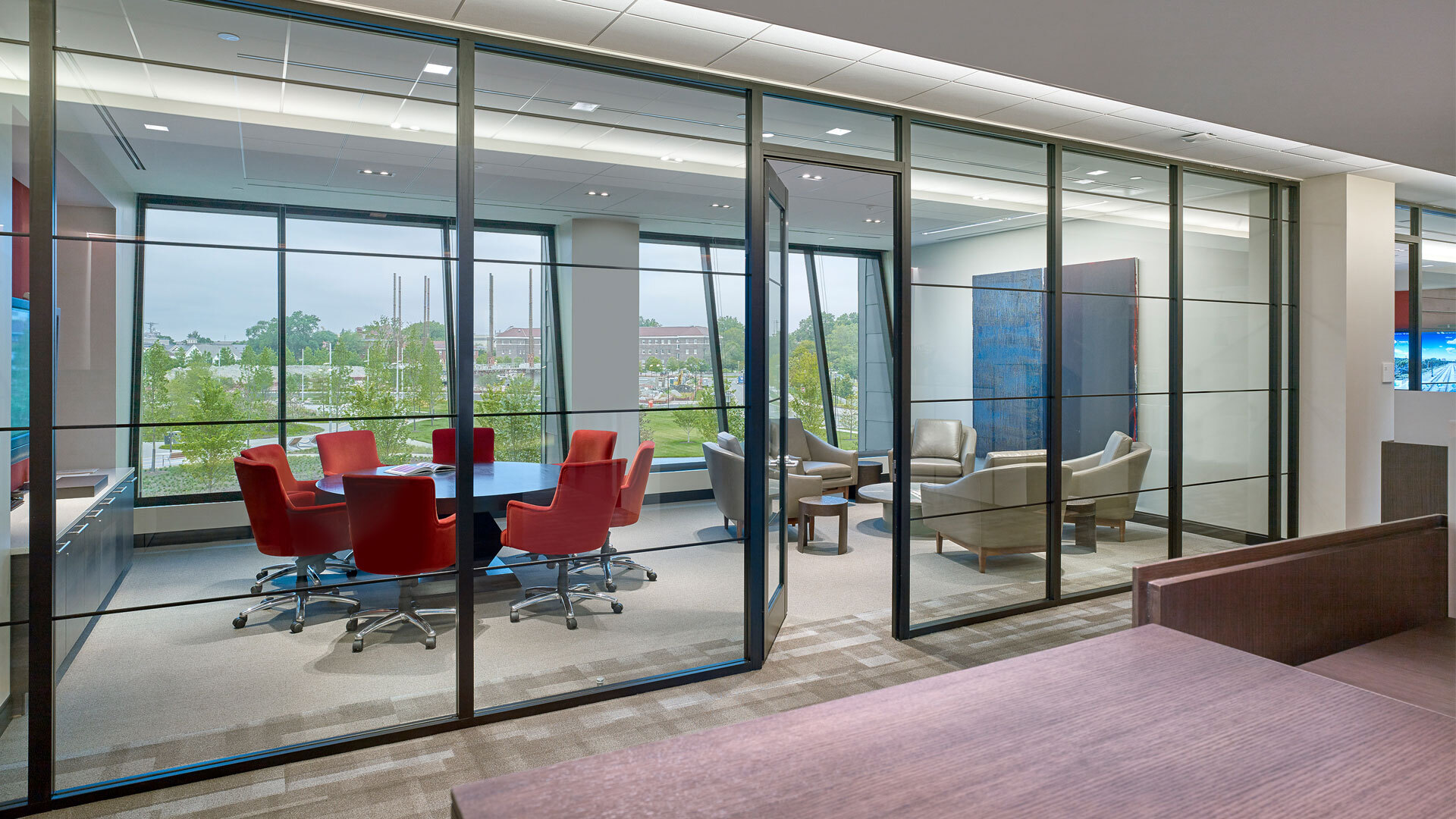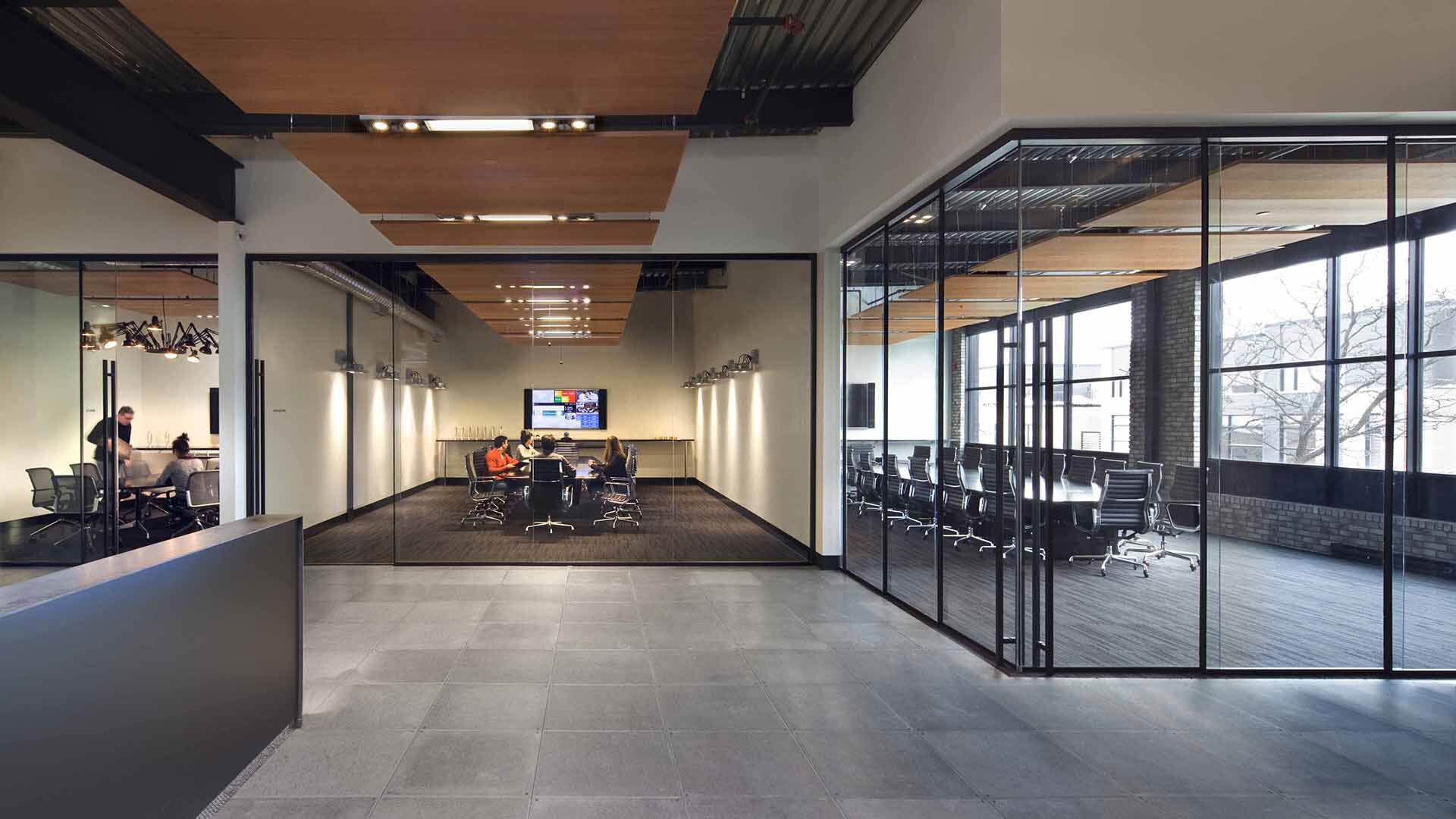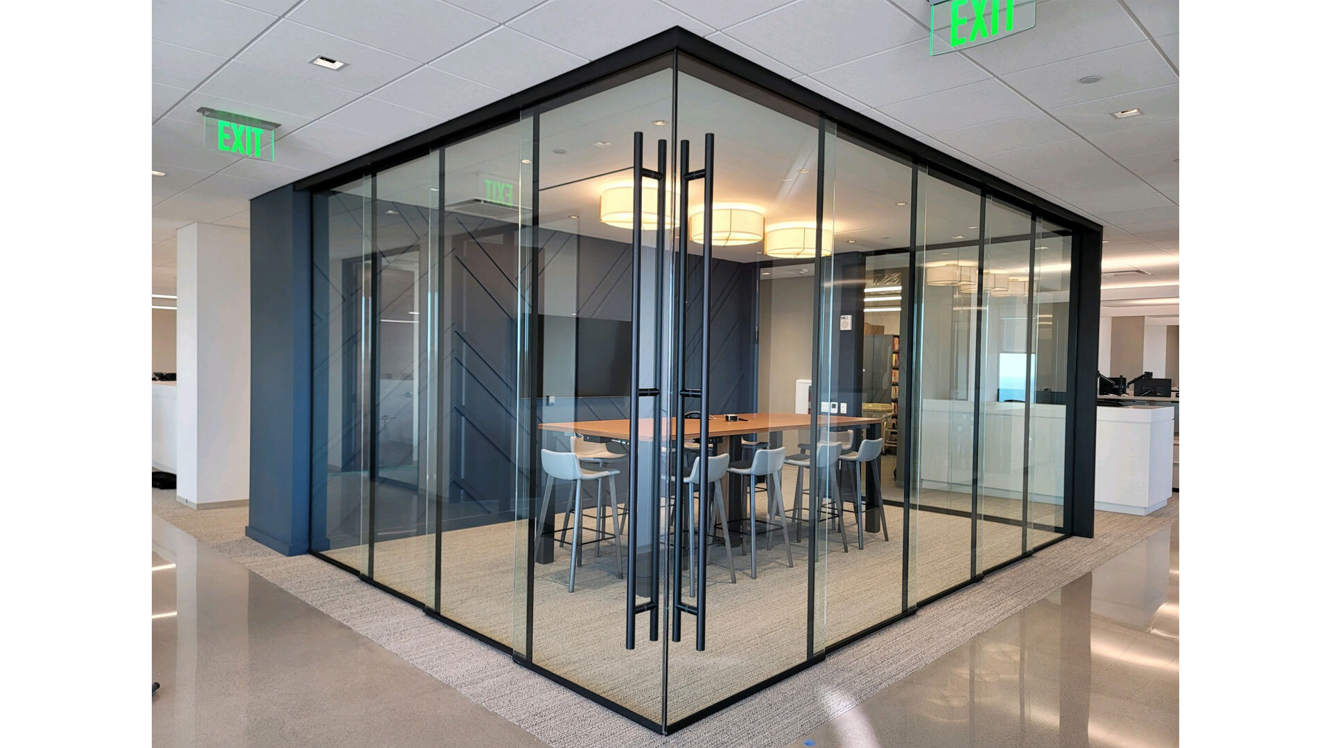 Meeting rooms: Double glazed FINO with vermillion powder coat finish and sliding doors with 48” ladder pulls.