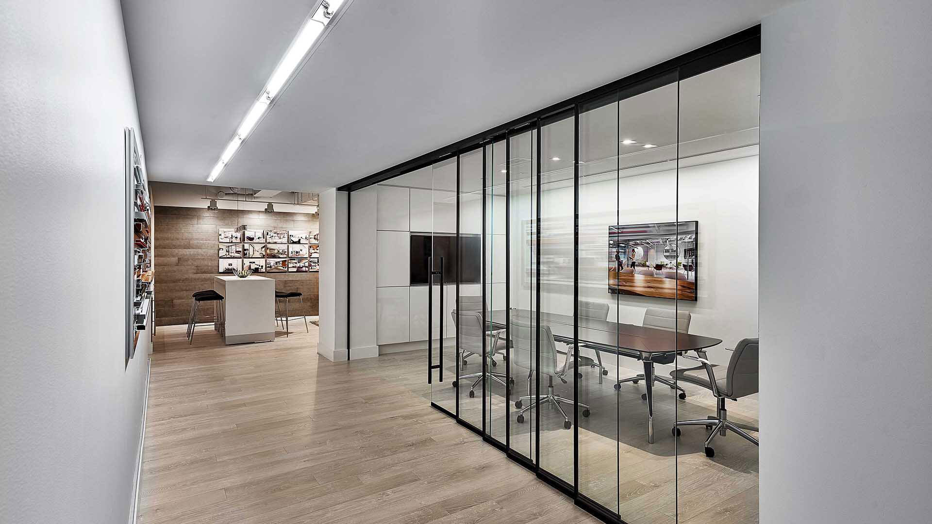 A forward thinking Media firm based in our hometown of Montréal, Canada. Incredible sleek store fronts with 50"+ wide sliding frameless doors for a stunning seamless look in this industrial decor.