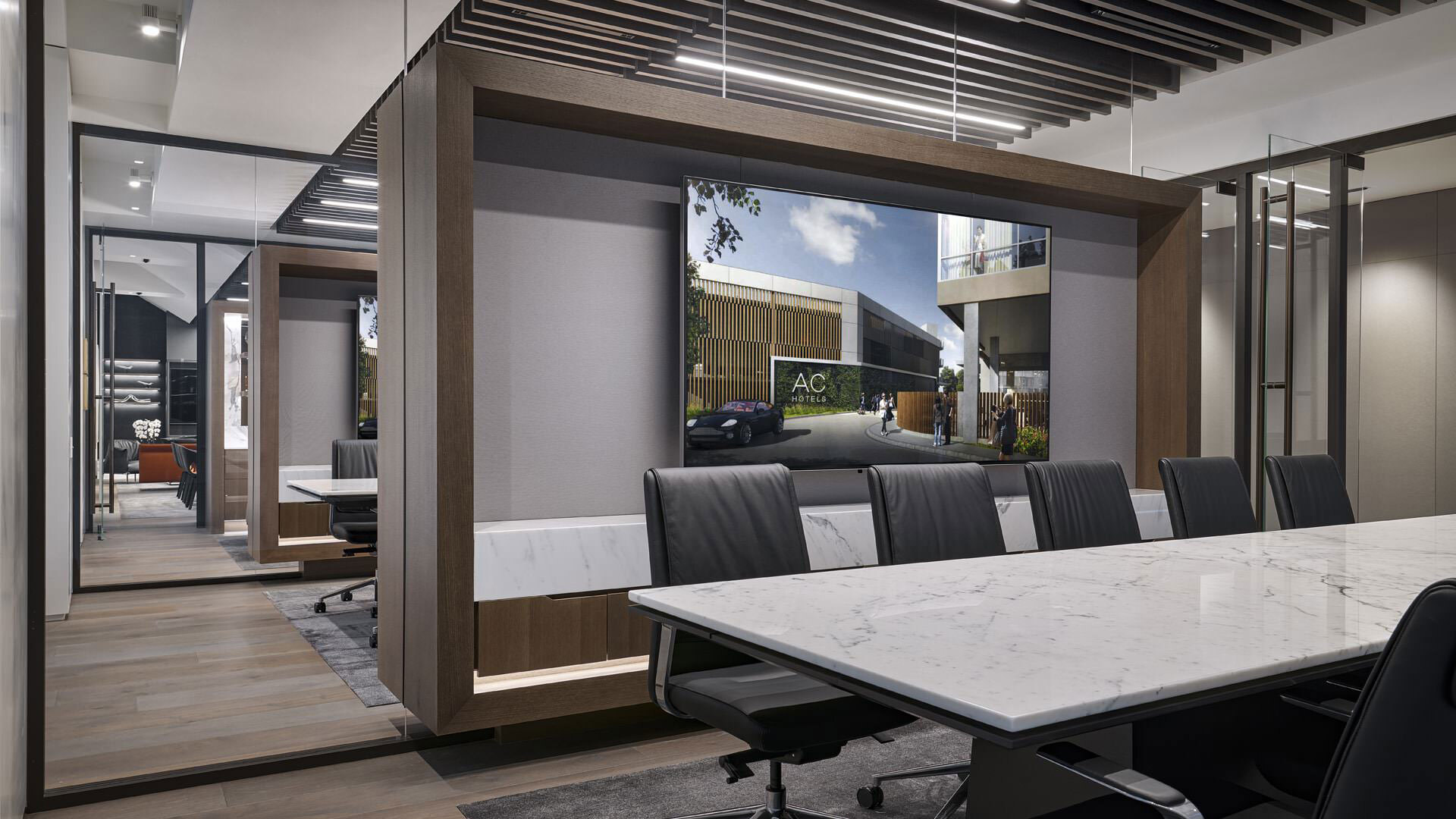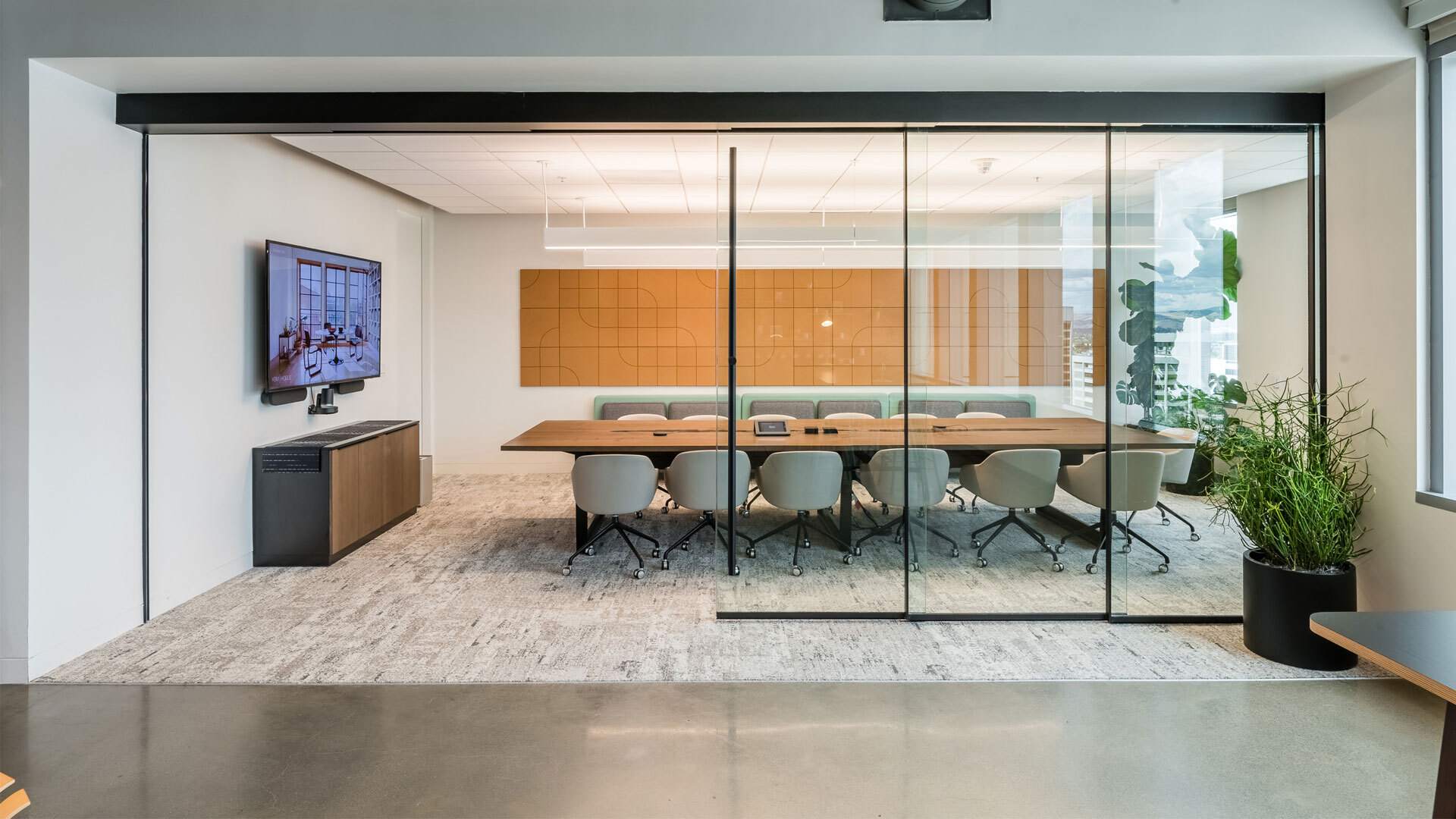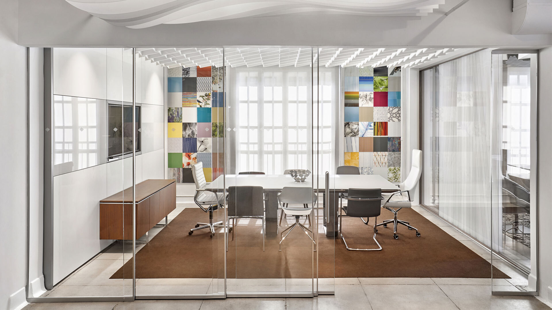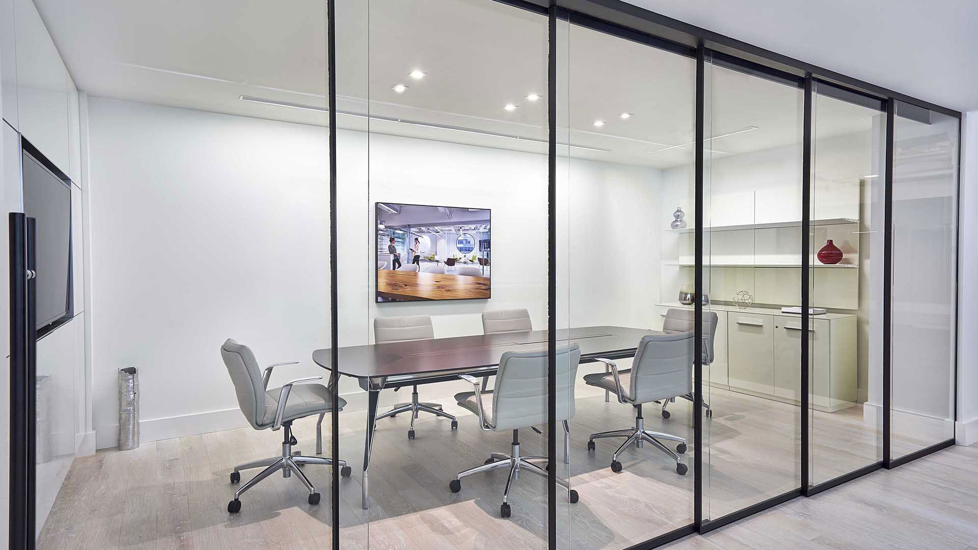 Meeting room: MIMO center glazed walls with clear anodized extrusions, polycarbonate joints, and pocket frameless sliding doors
