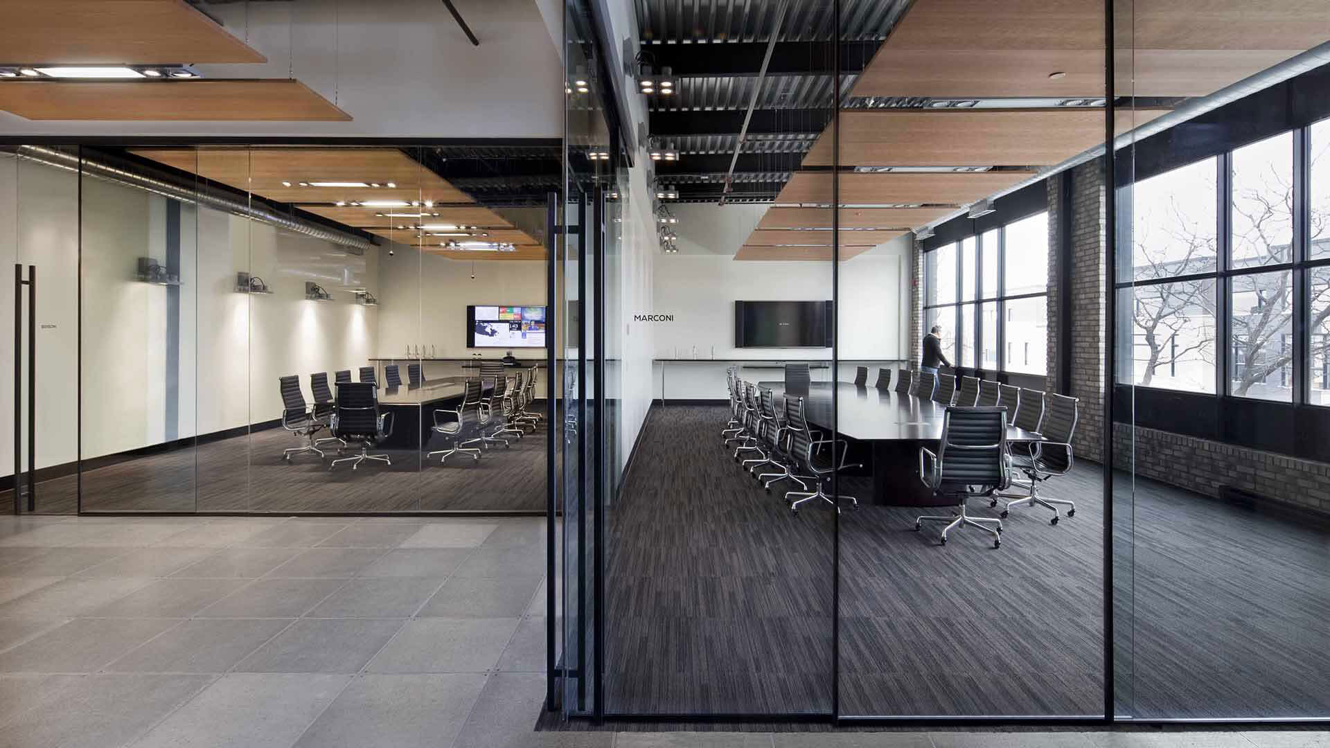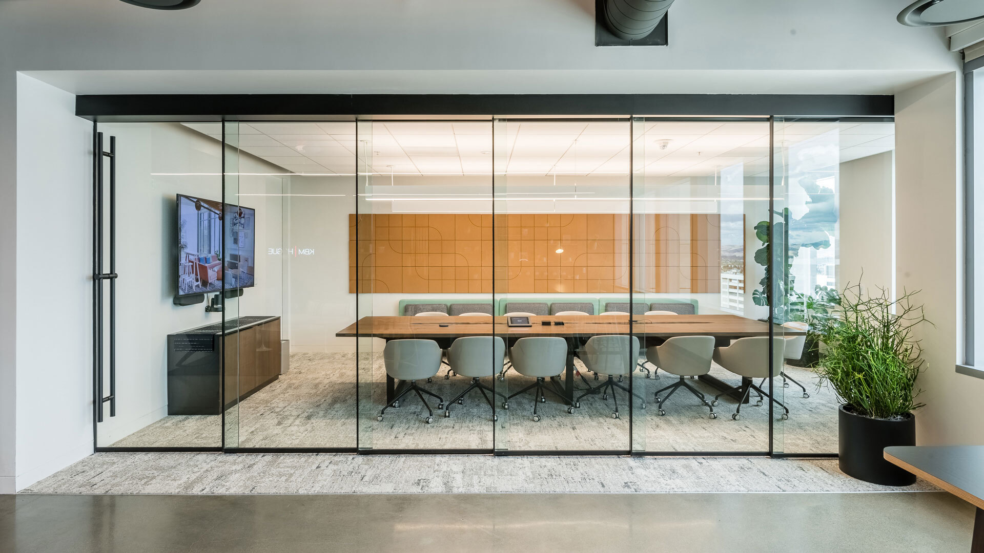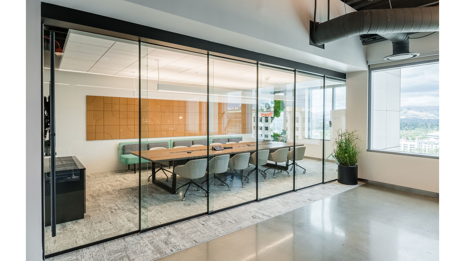Meeting room: MIMO center glazed walls with clear anodized extrusions, polycarbonate joints, and pocket frameless sliding doors. (c) photo by Muraflex