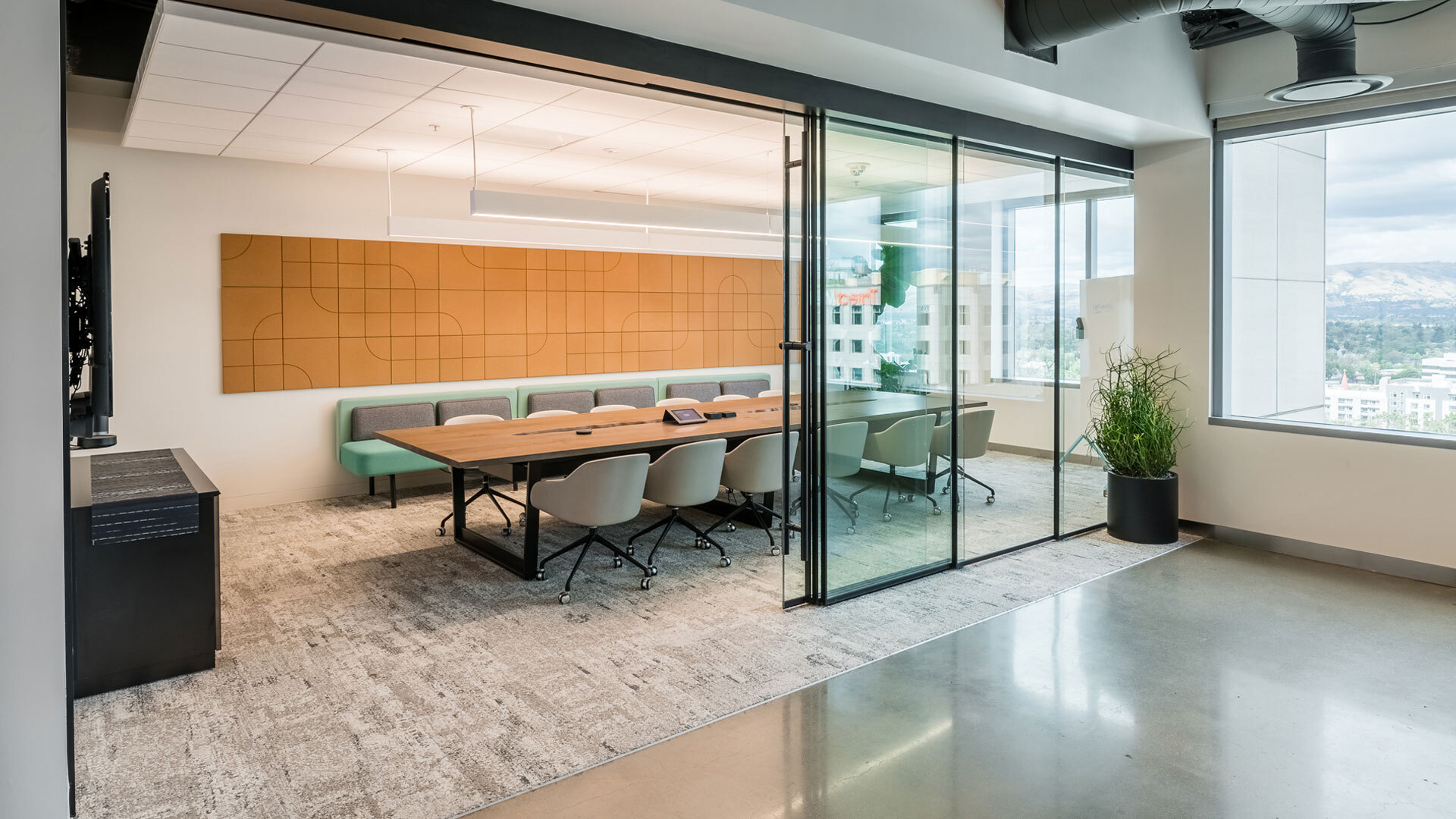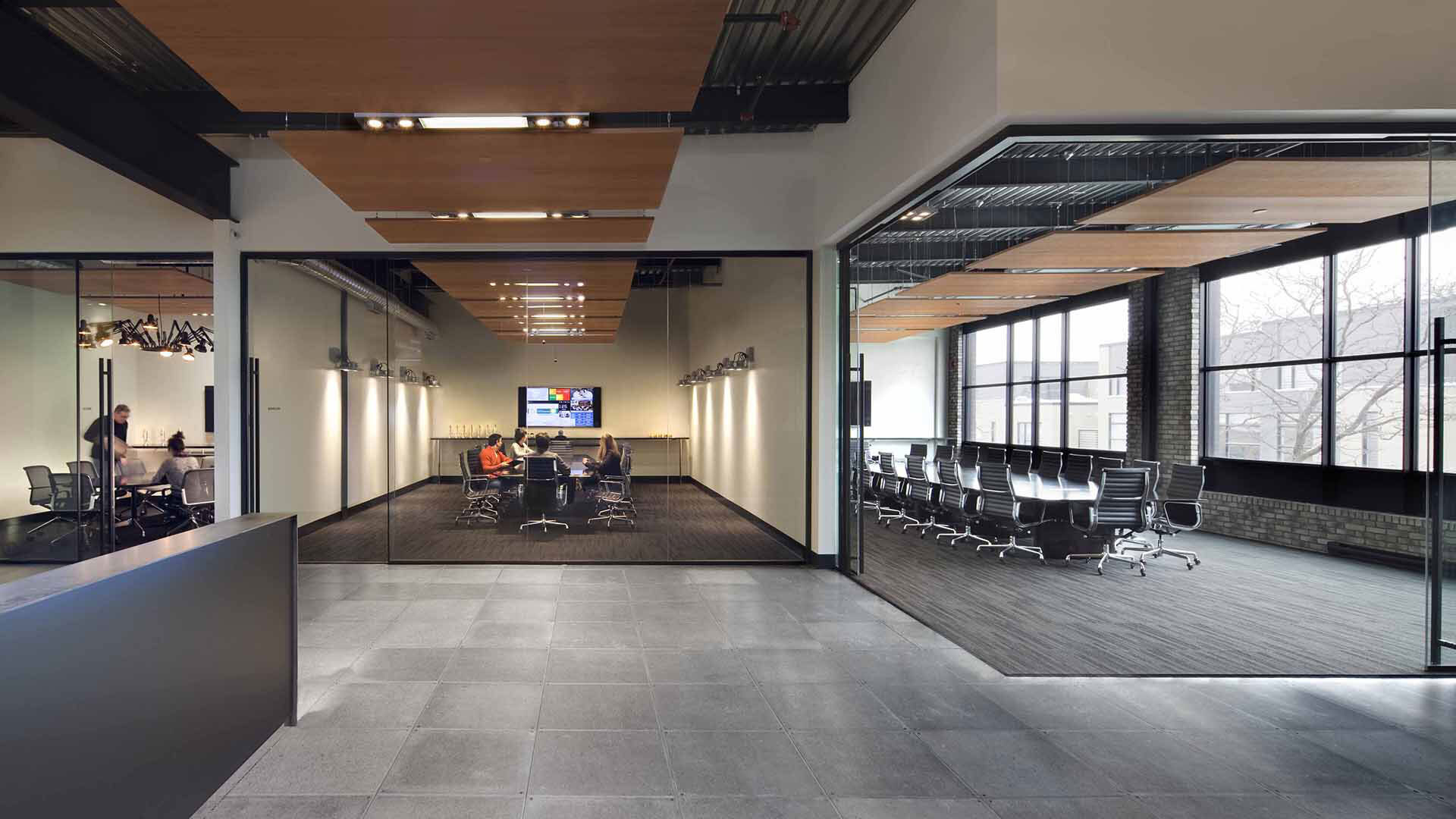 Conference room: MIMO offset glazed with black anodized extrusions, polycarbonate joints, and frameless sliding pocket doors with polished ladder pulls. (c) photo by TPG Architecture, LLP