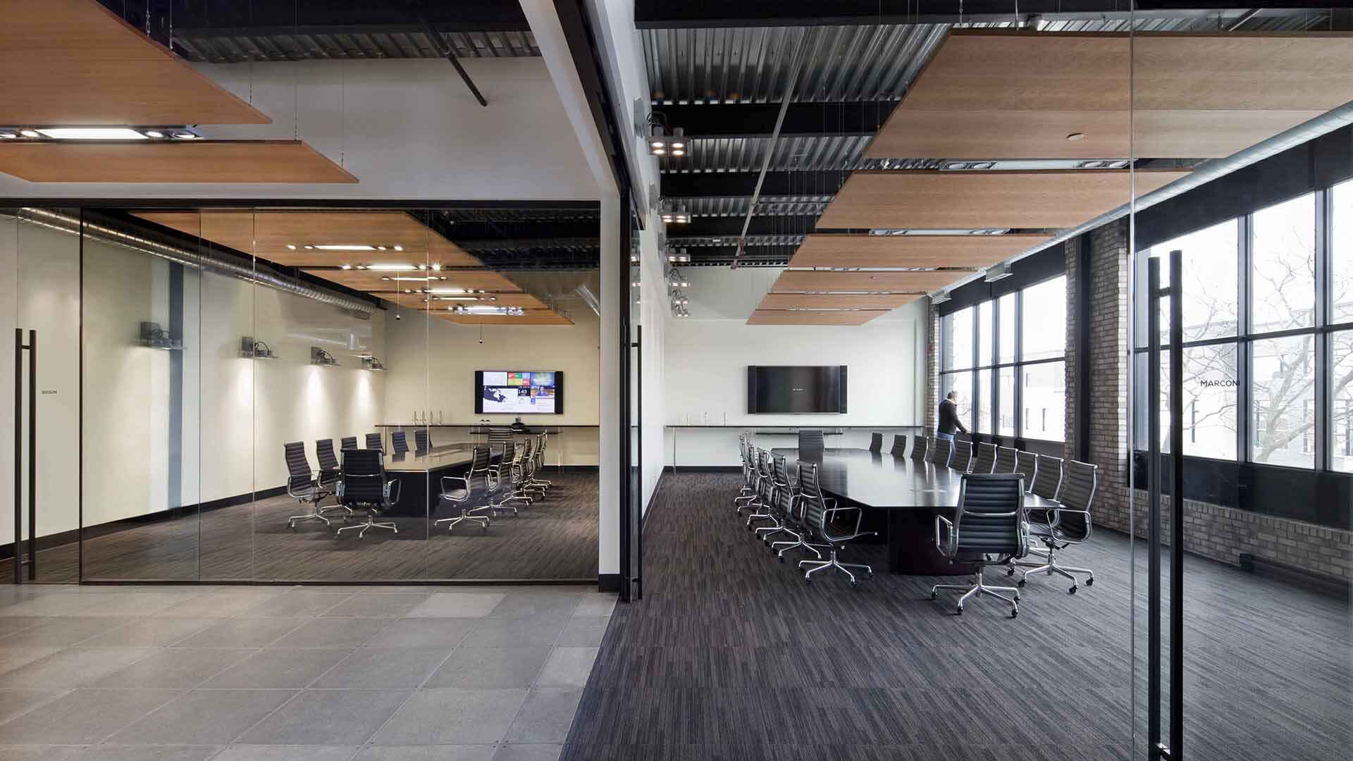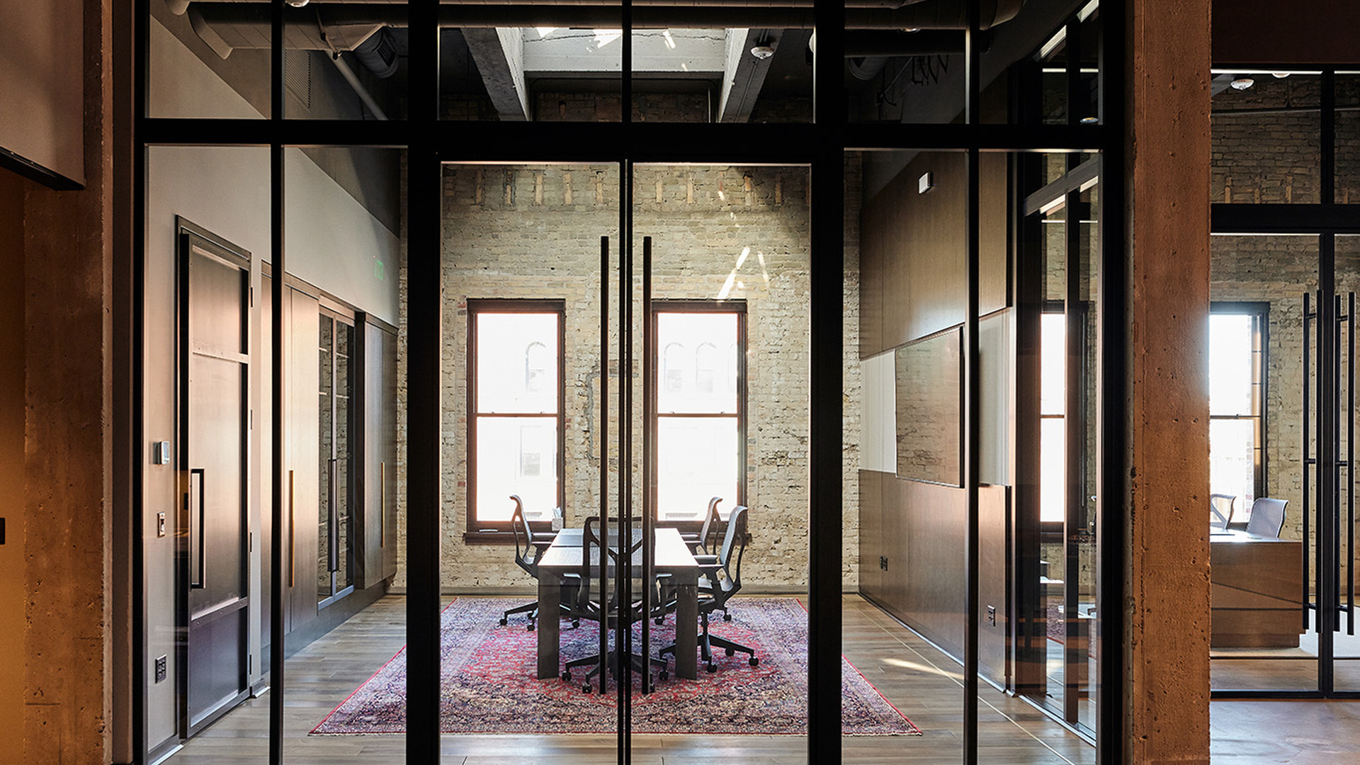 Exposed brick walls, black anodized finish, and generous use of vertical mullions, this finance firm in Minneapolis has incorporated modern, minimalist elements in a space that has an antique touch. These MIMO walls exude a peaceful environment and a great platform for collaboration and imagination.