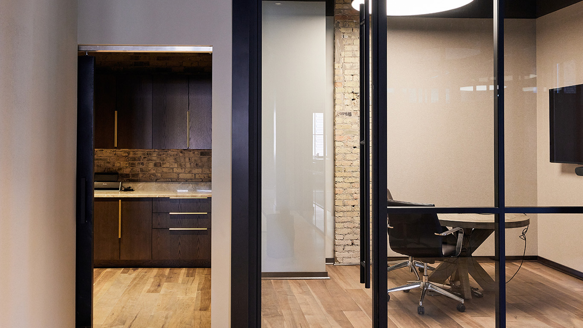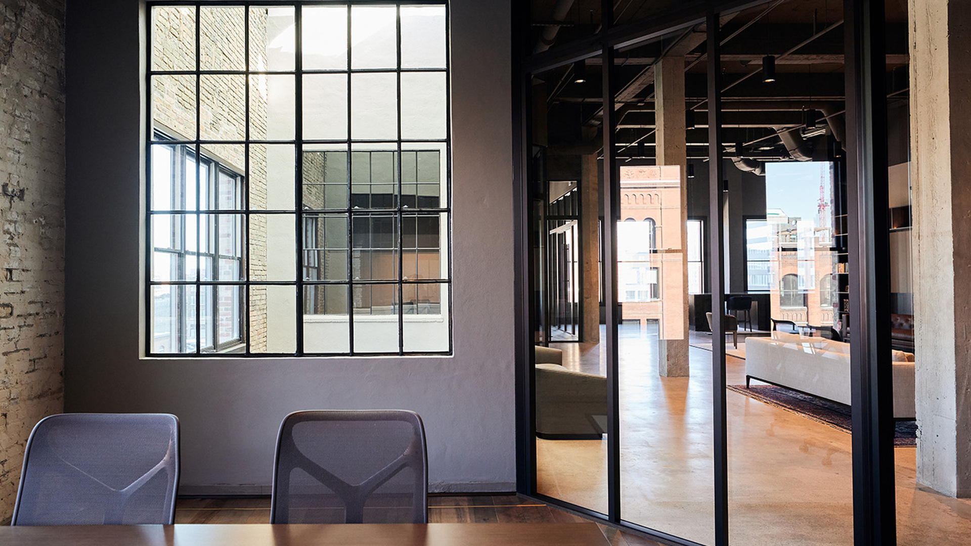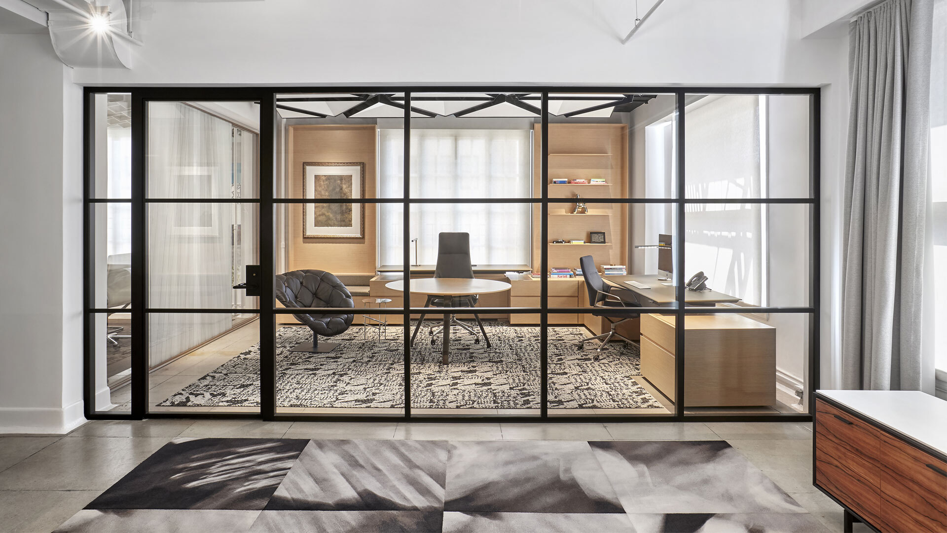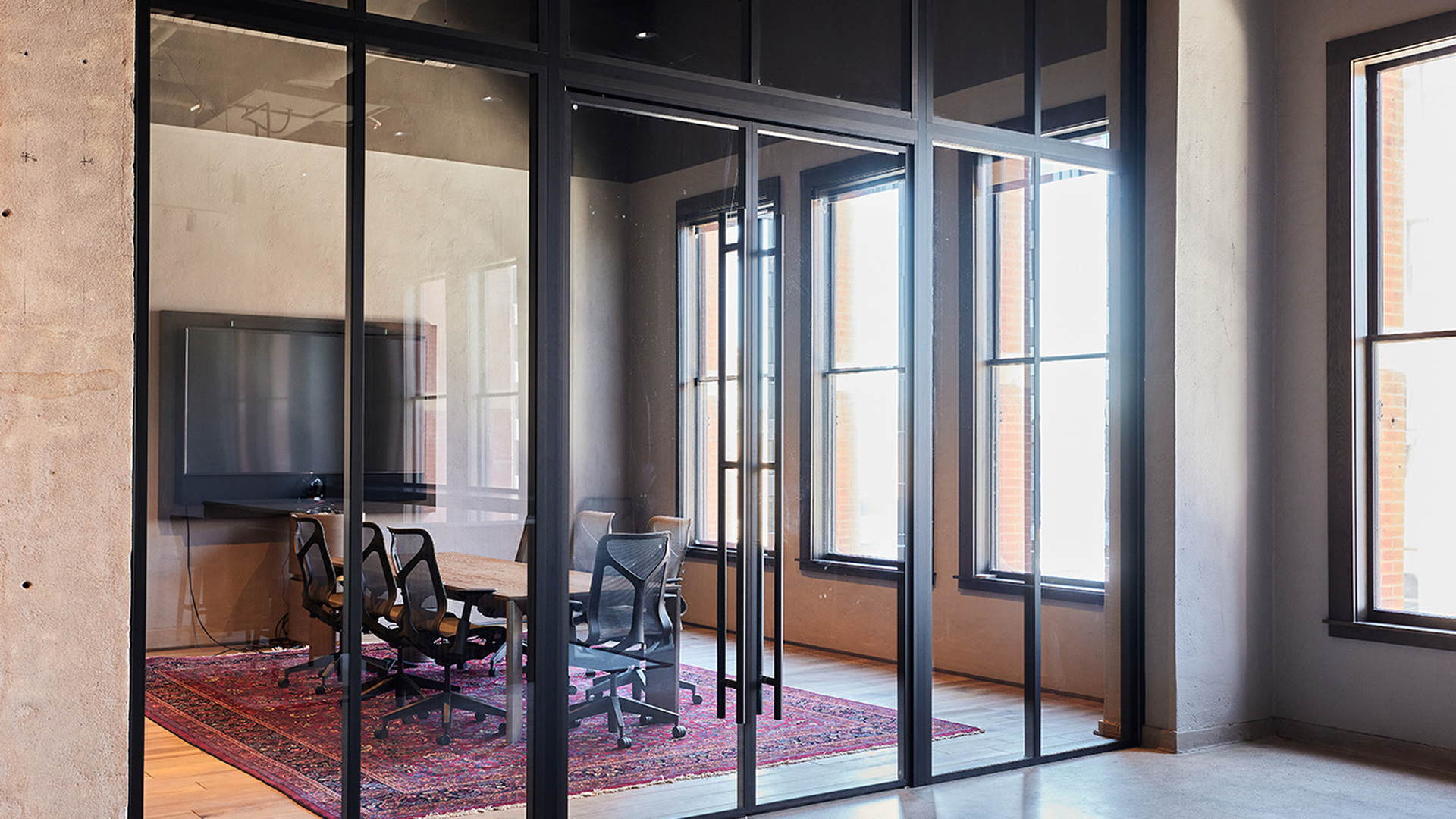 Single and double glazed walls framed by anodized black extrusions with polycarbonate joints and sliding doors with 84" ladder pulls. A modern and industrial look for a New York City-based headquarters.