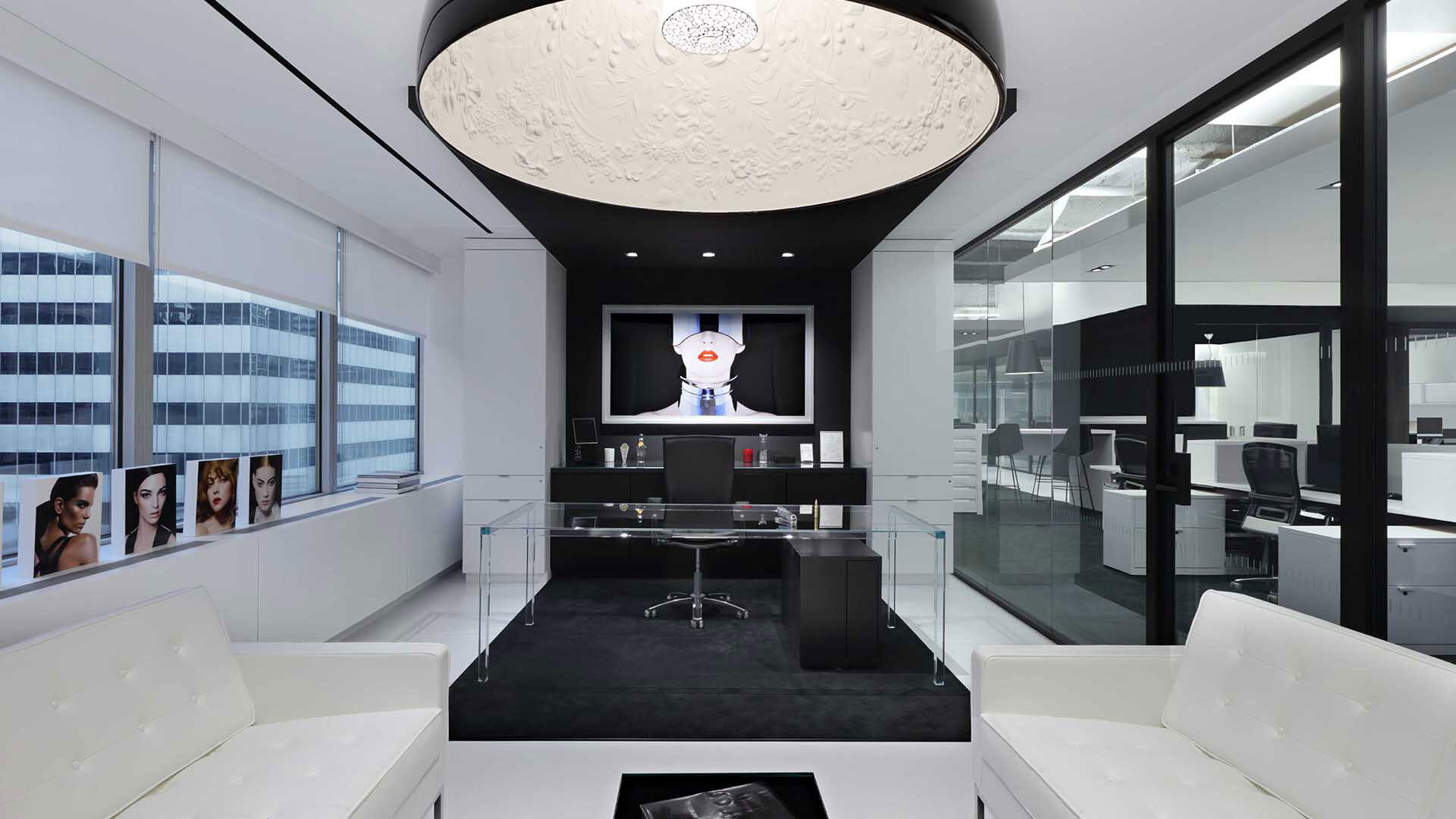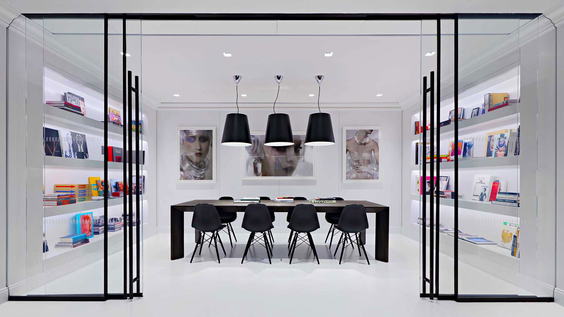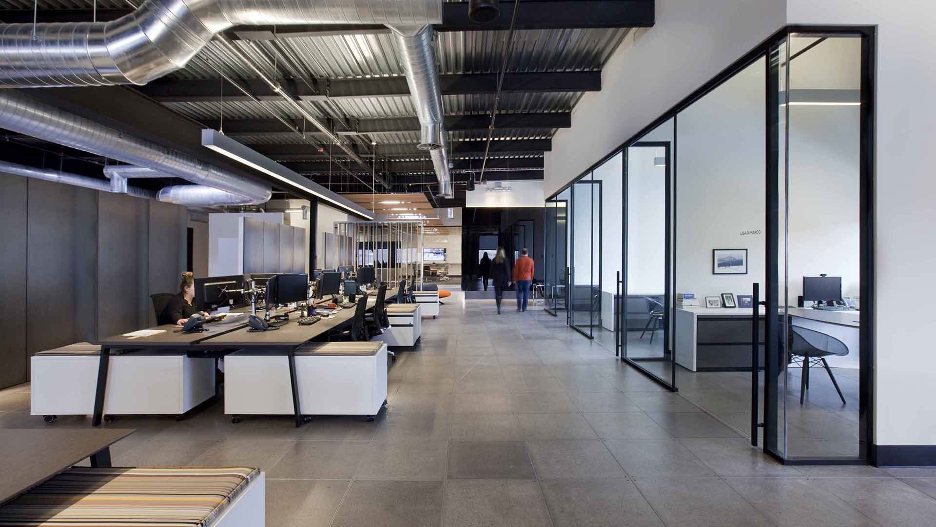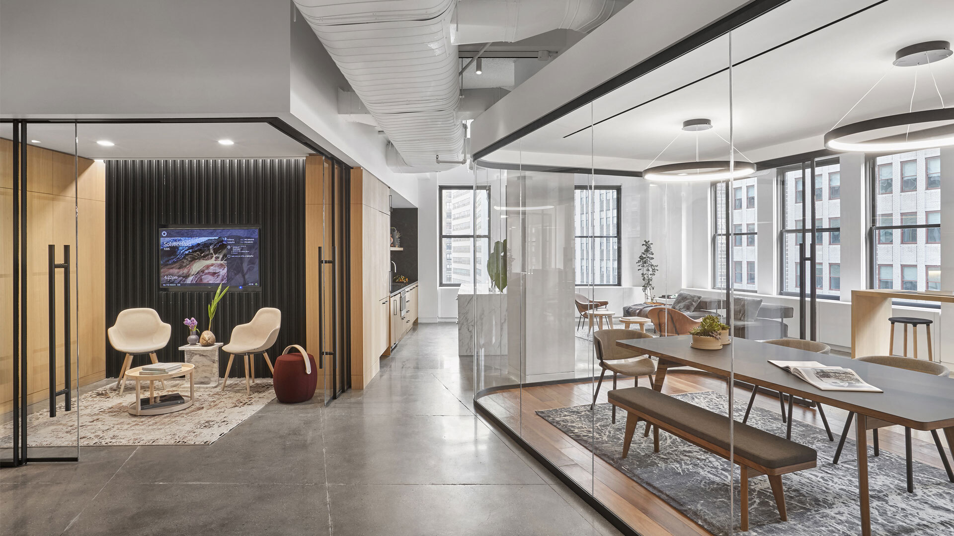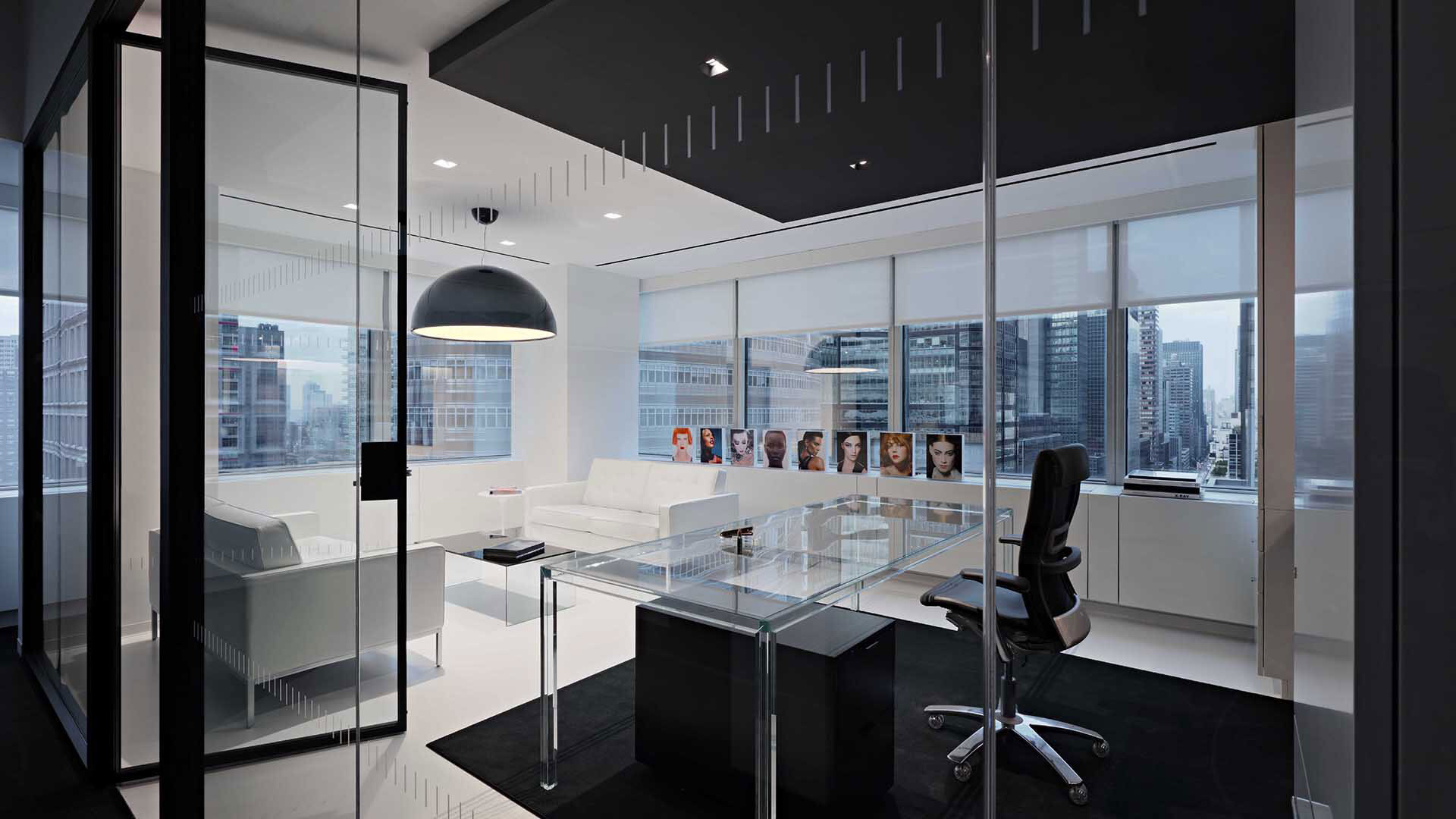 Single and double glazed walls framed by anodized black extrusions with polycarbonate joints and sliding doors with 84" ladder pulls. A modern and industrial look for a New York City-based headquarters.