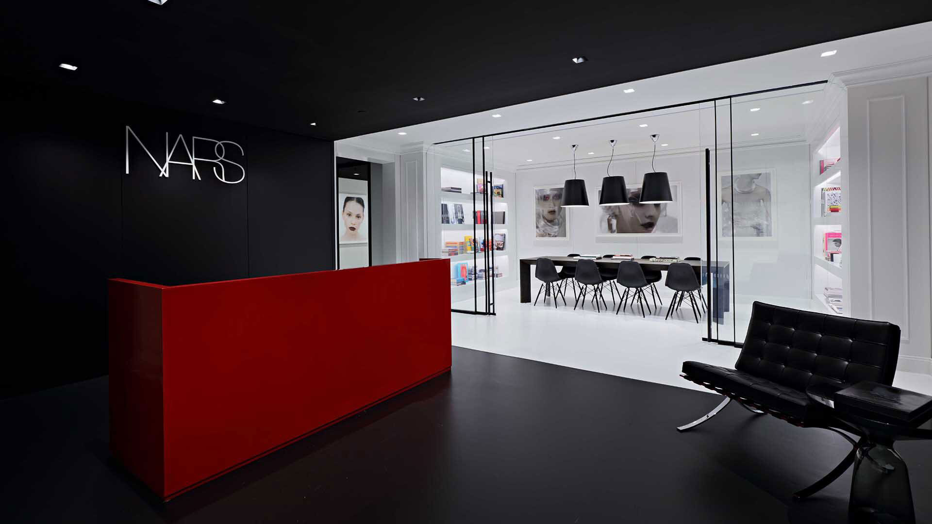 A design statement for the major fashion-forward cosmetic brand. EXPO in the black anodized aluminum extrusions contributes perfectly to NARS' strong fashion statement.