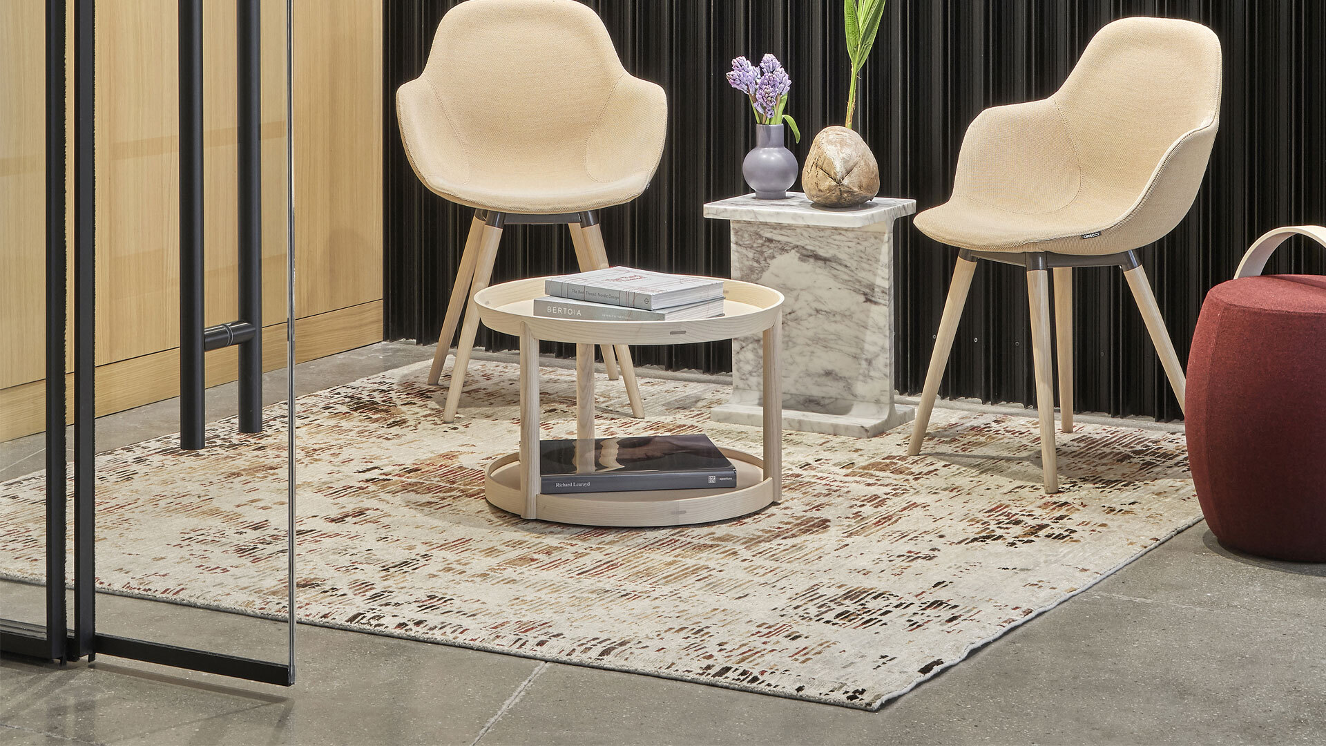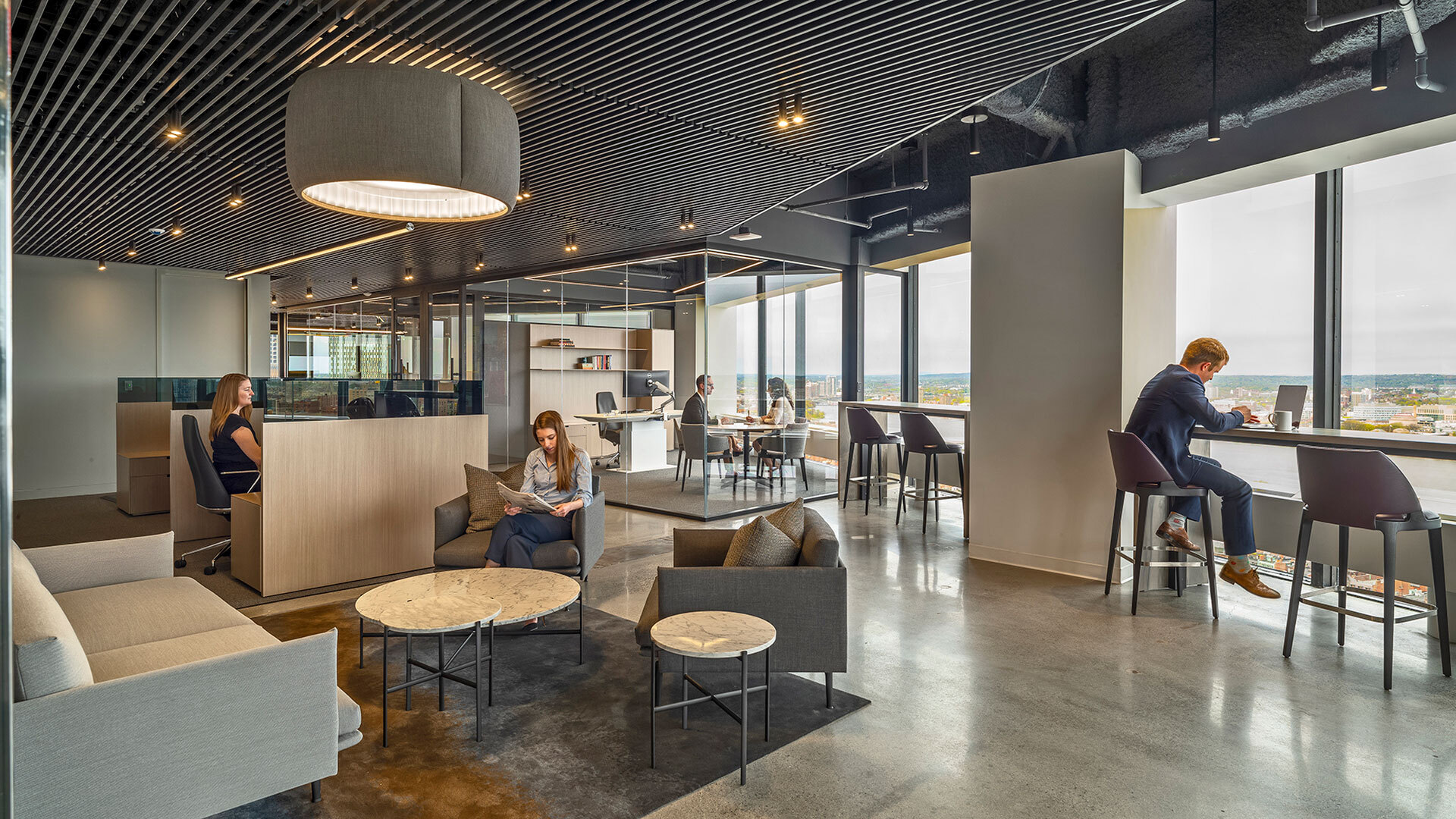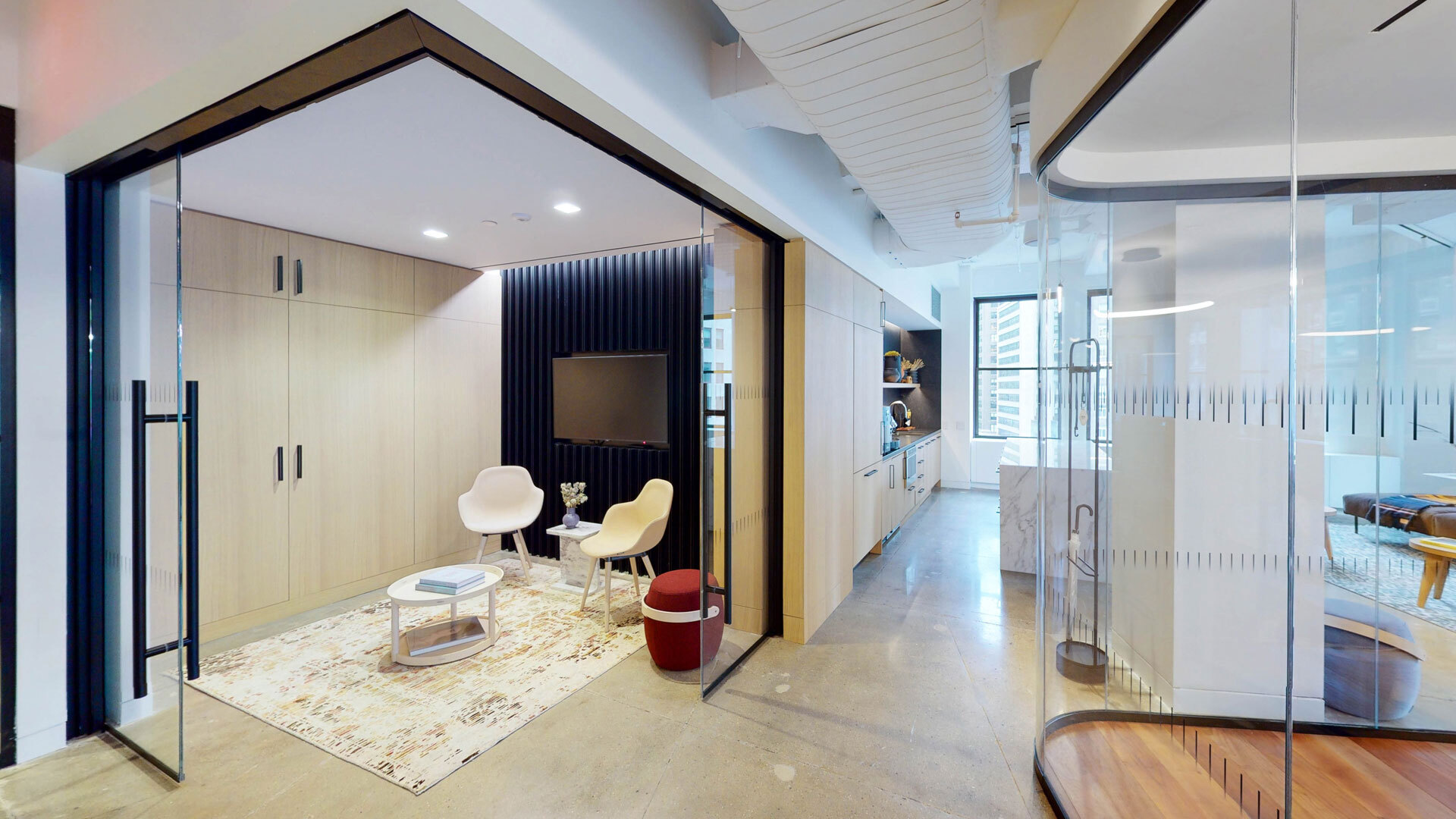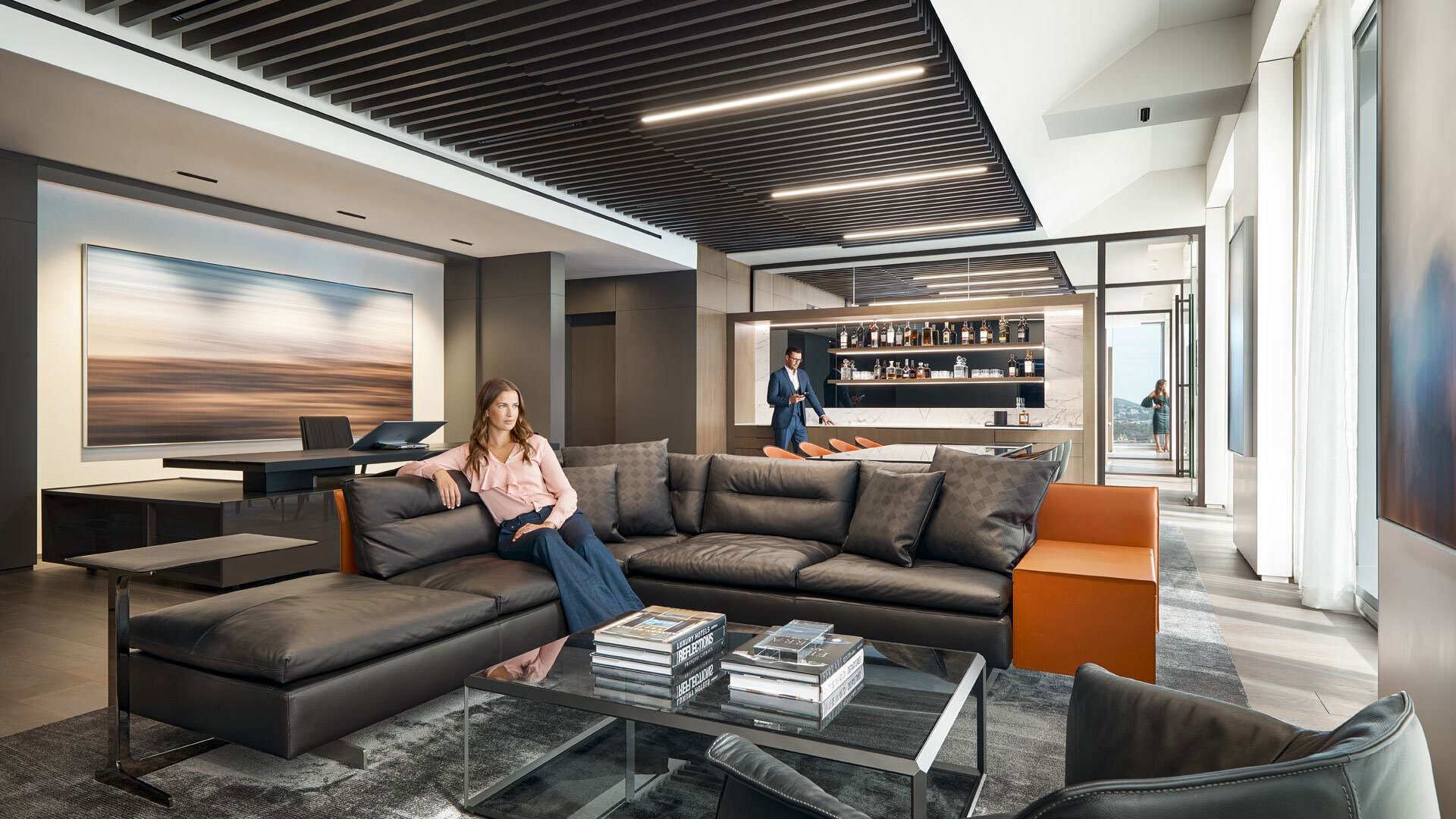 Sitting area with FINO walls in architectural bronze finish and distinction markers.
