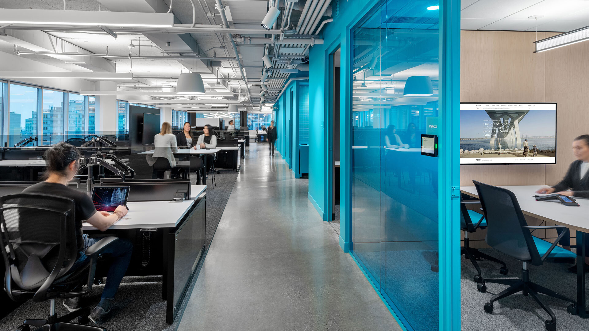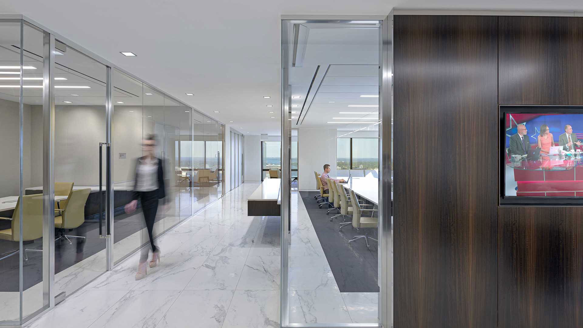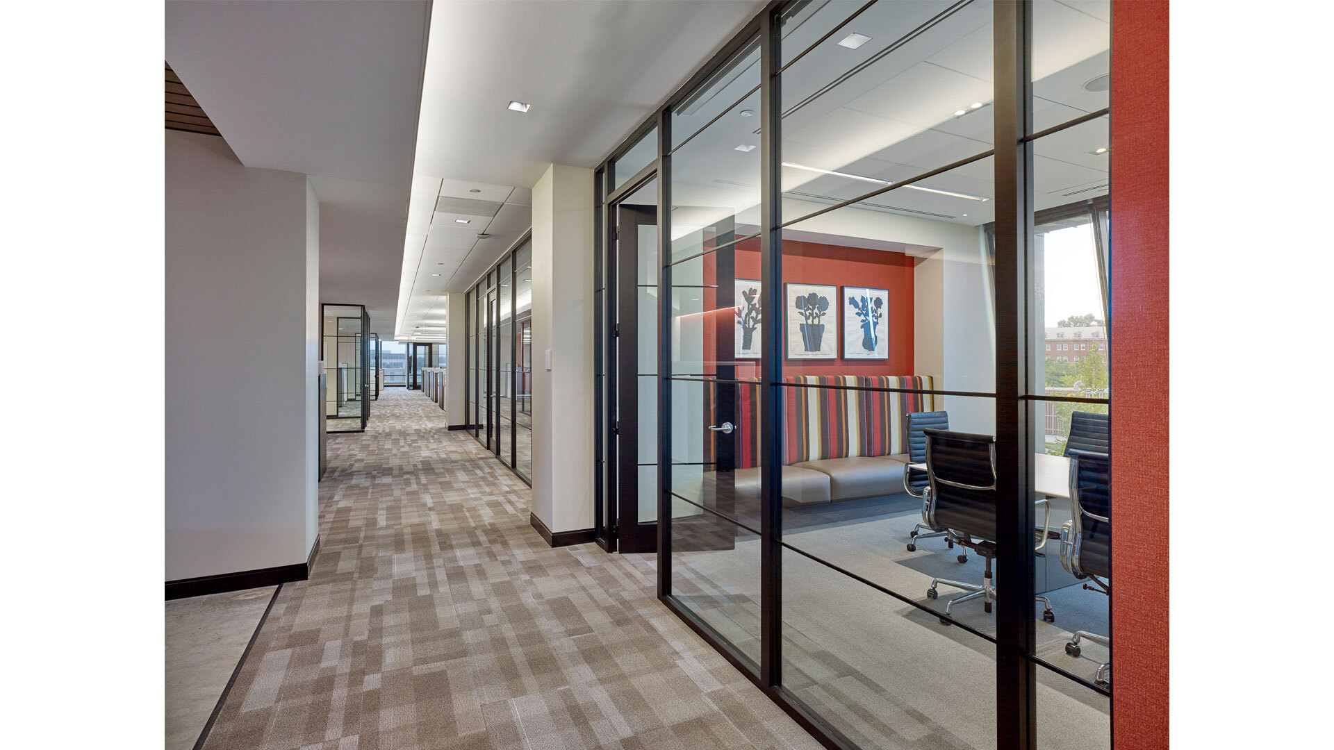 Hallway: Open office concept alongside meeting rooms with specialty glass and room schedulers next to doors with ladder pulls.