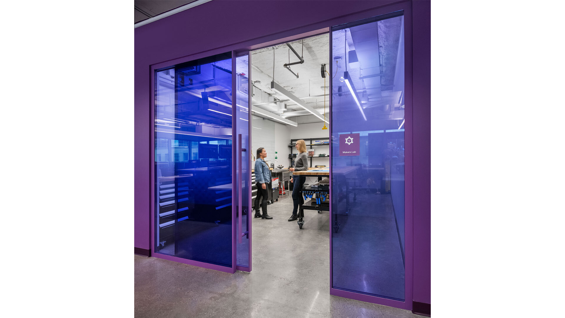 Laboratory storefront: FINO in the white powder coat finish with switch glass off. (a) photo by Kevin Chu