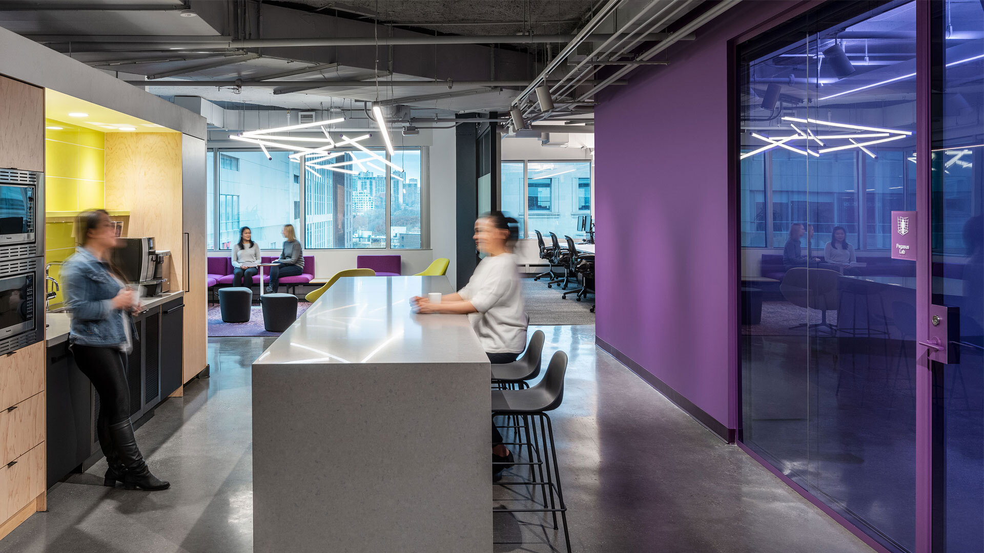 Cafeteria: MIMO glazed walls at the corner of the corridor and common kitchen area.