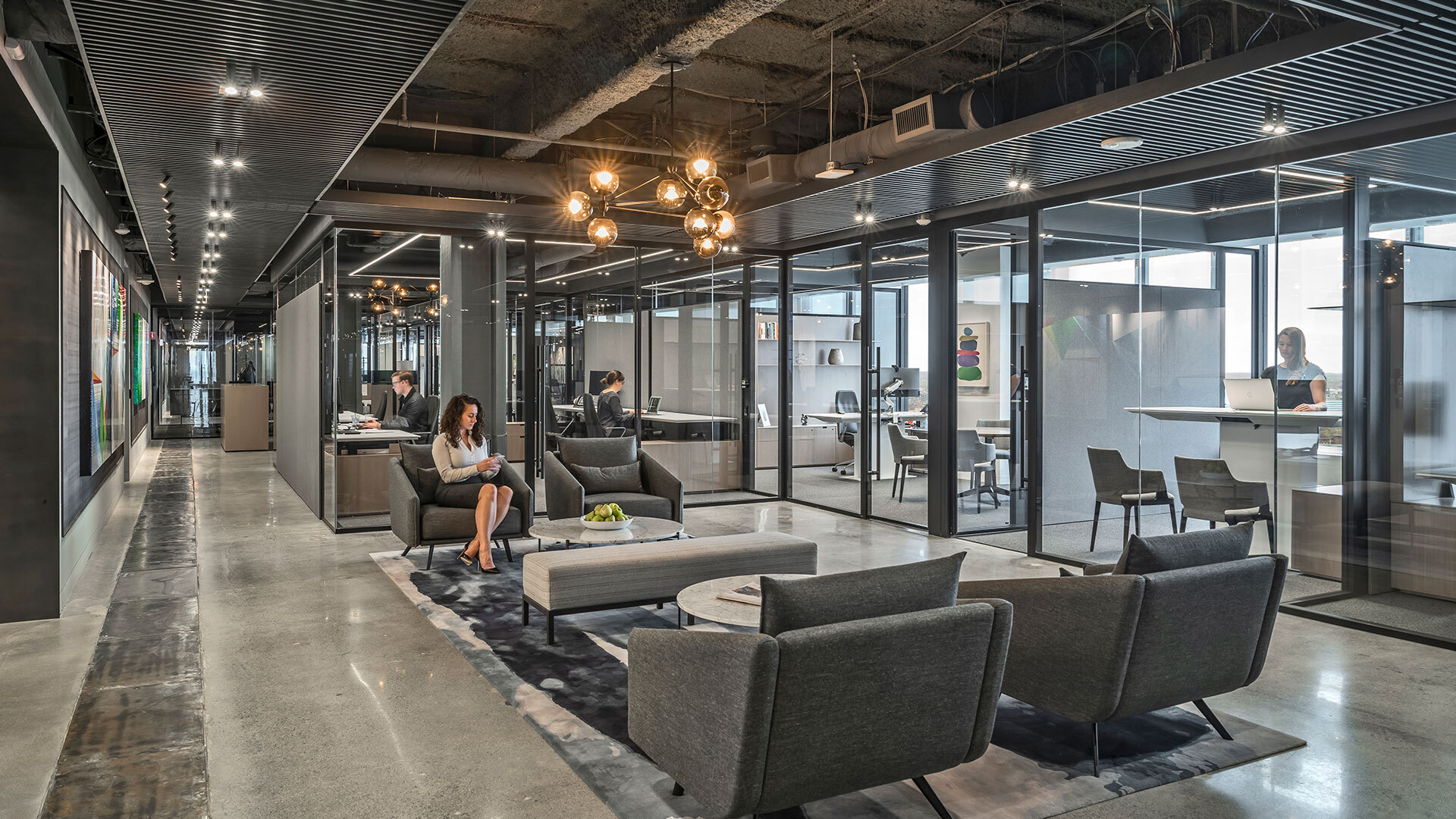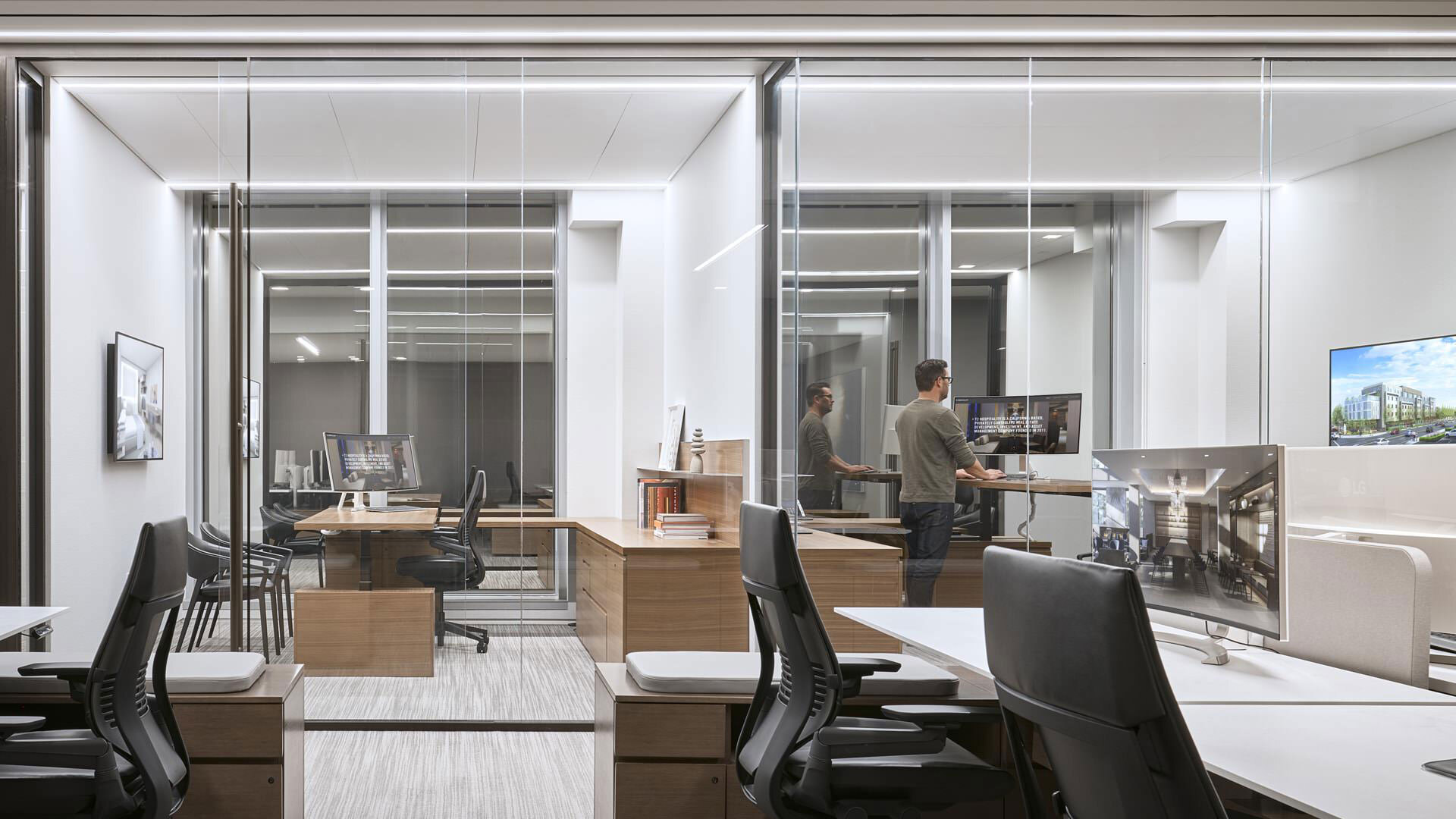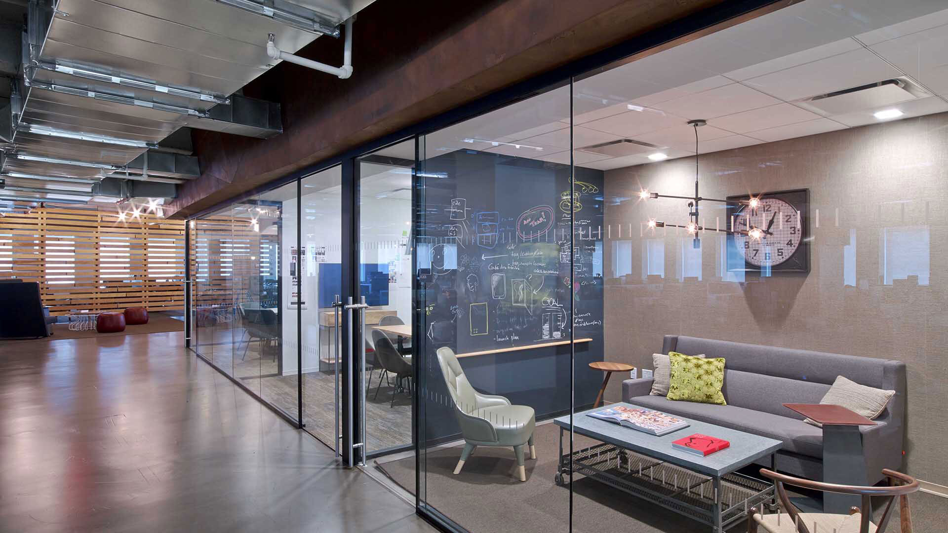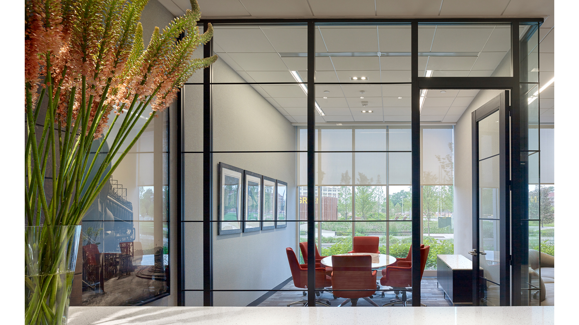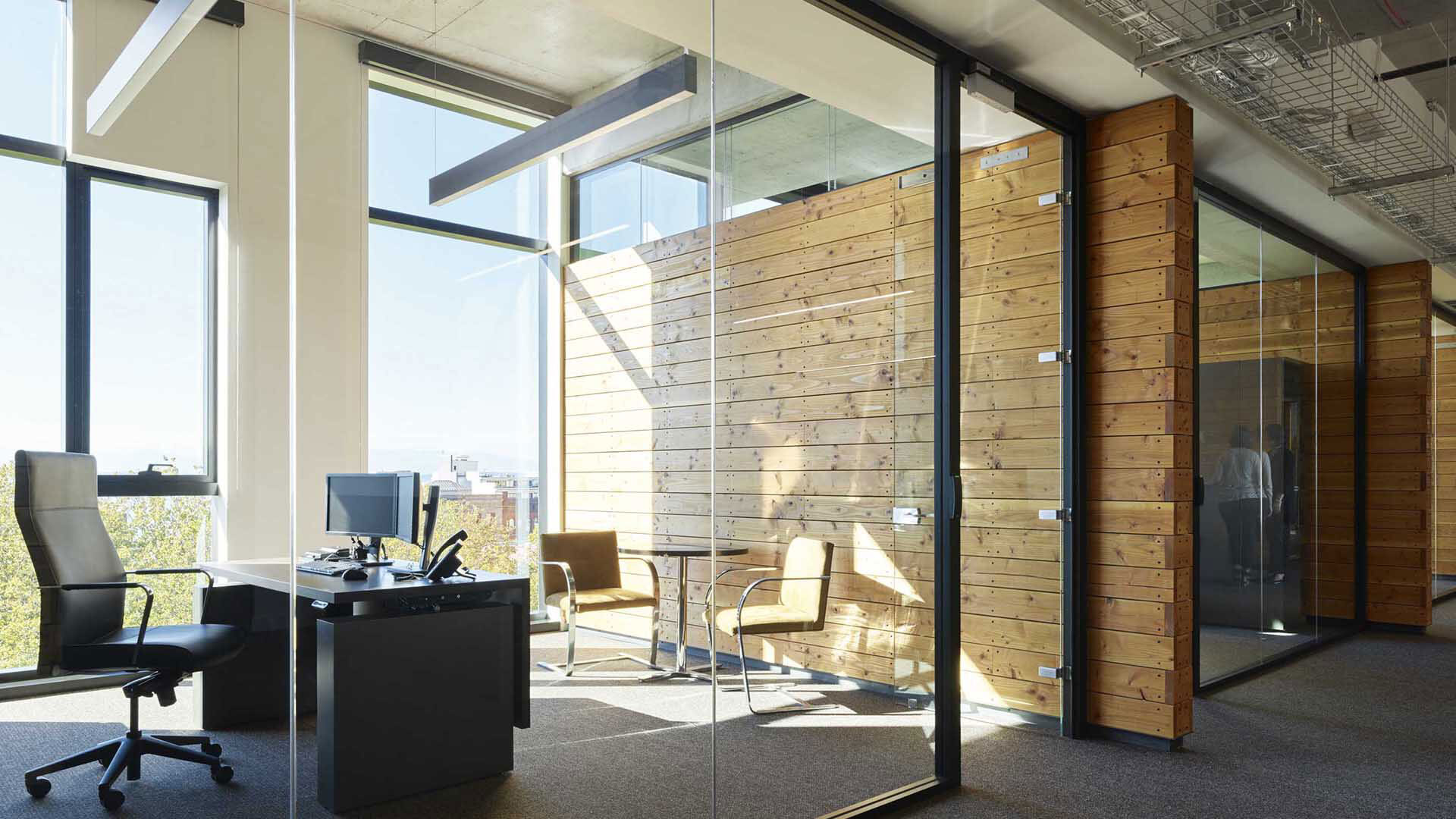 Office: Black anodized MIMO glazed walls looking out to common sitting area.