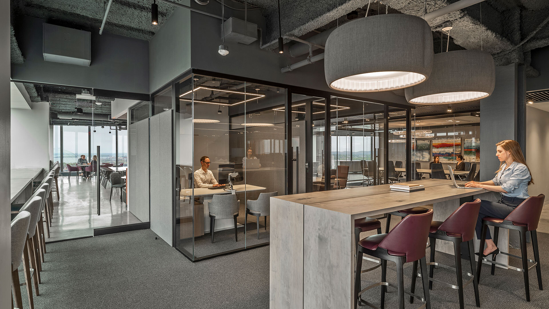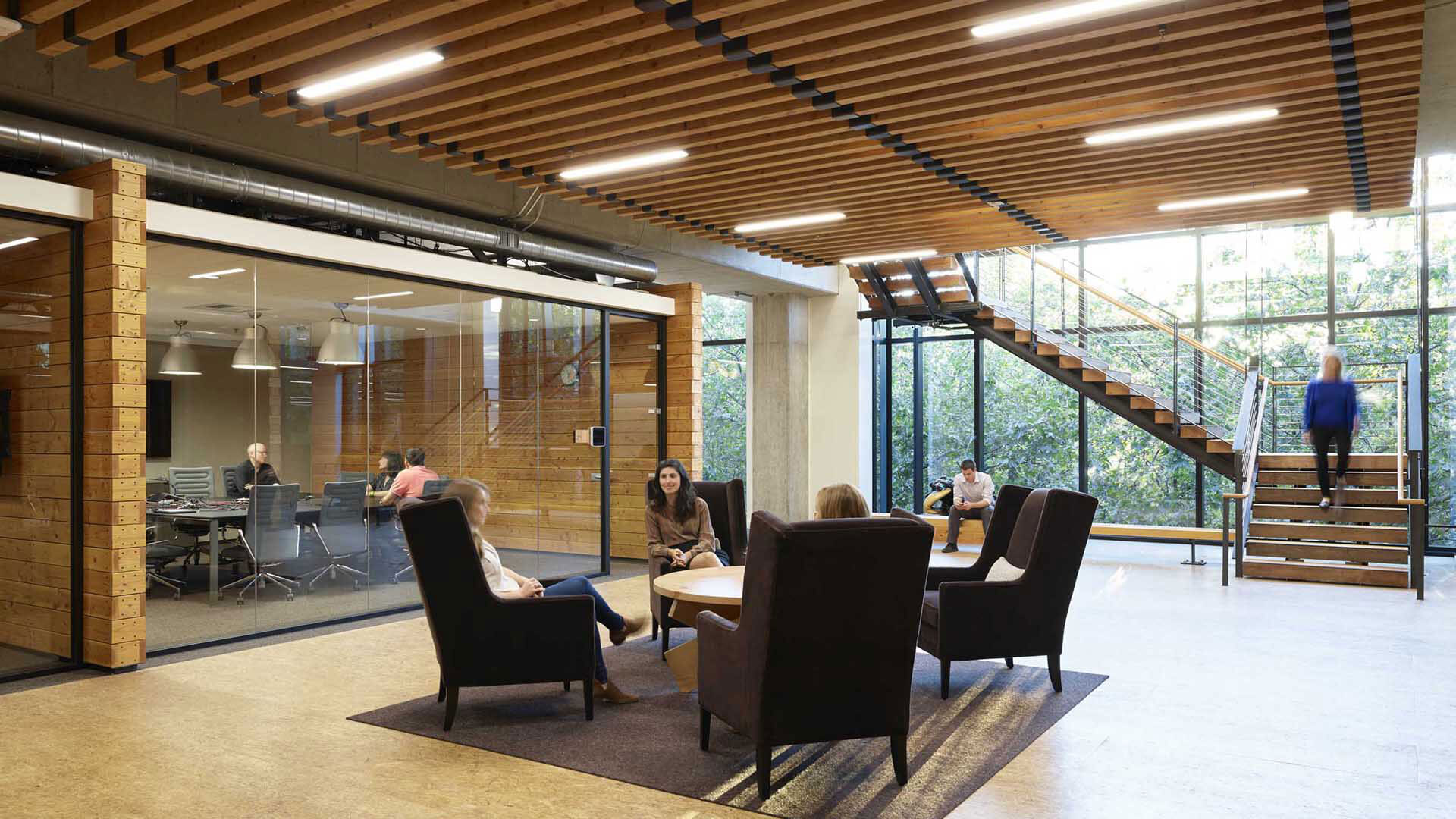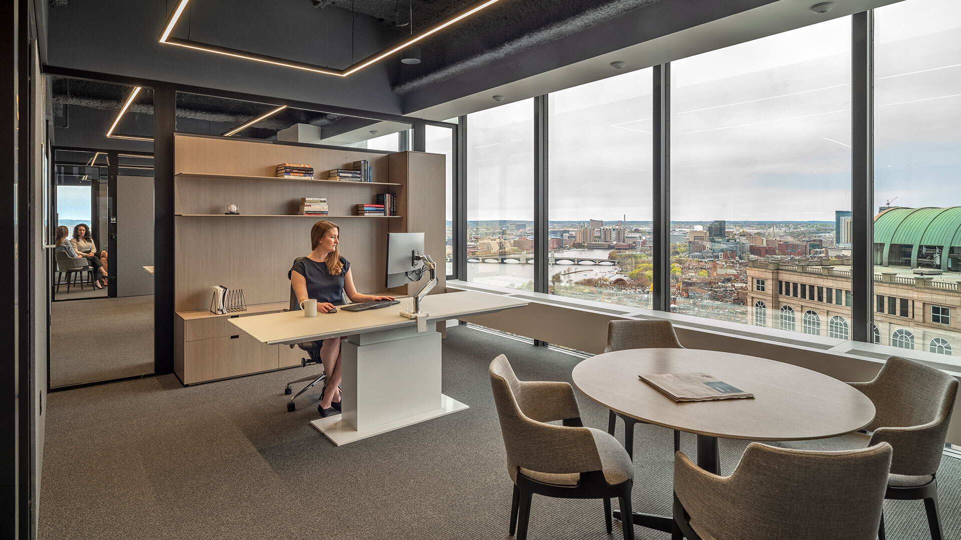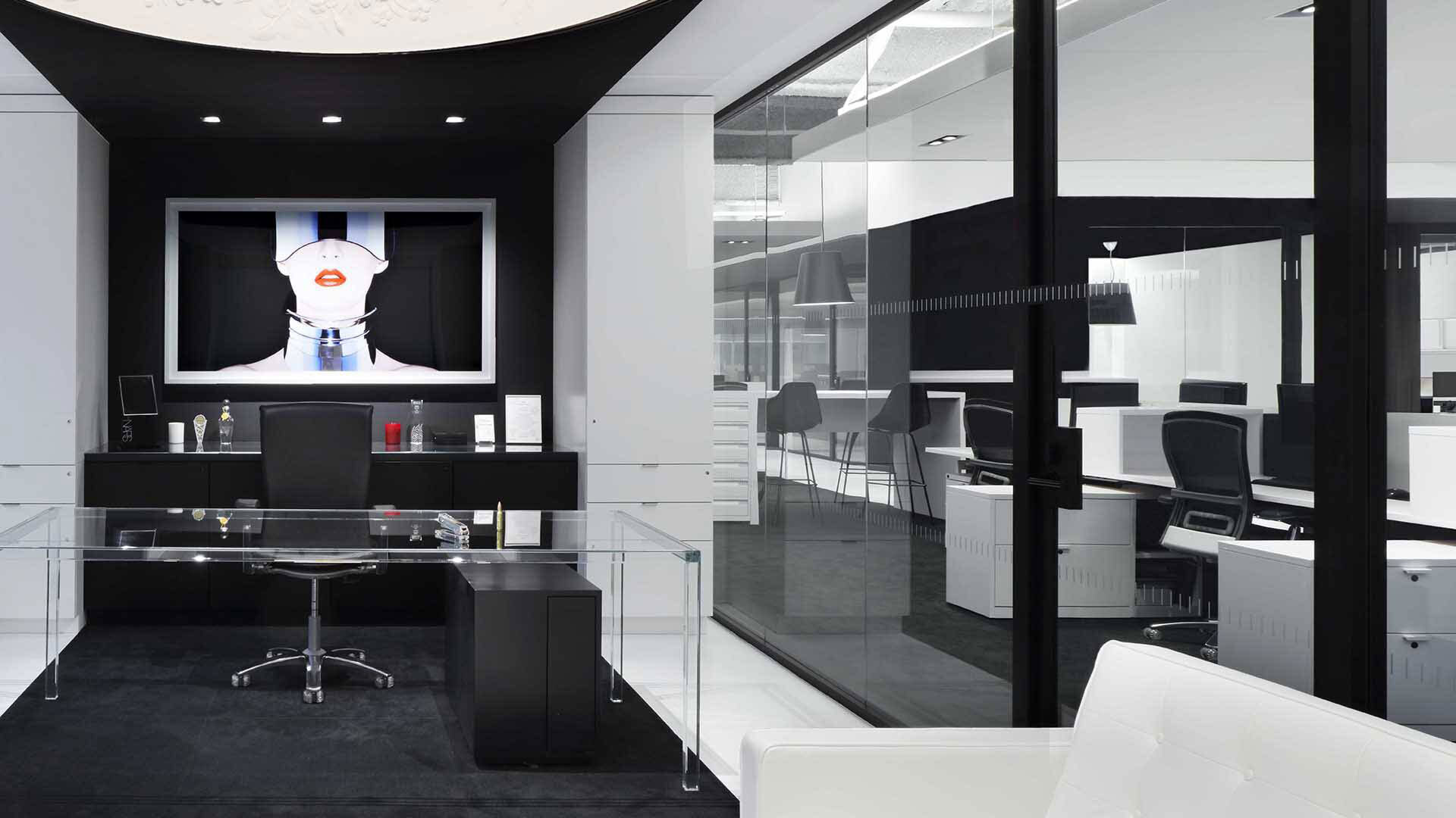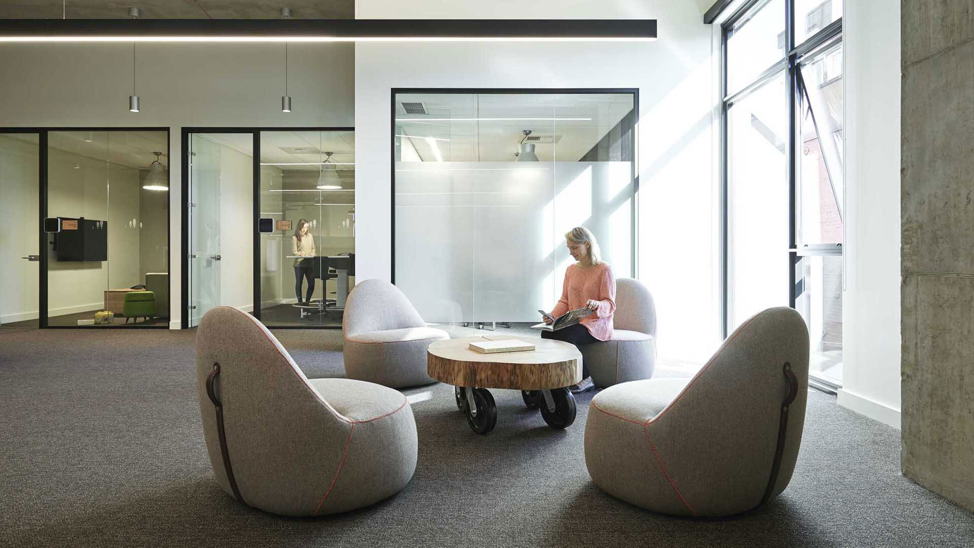 Office: Black anodized MIMO glazed walls looking out to common sitting area.