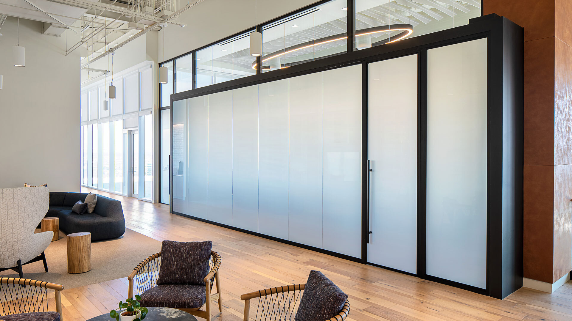 Meeting room: EXPO in the black anodized finish and ladder pull hardware. Position open. (c) photo by Muraflex