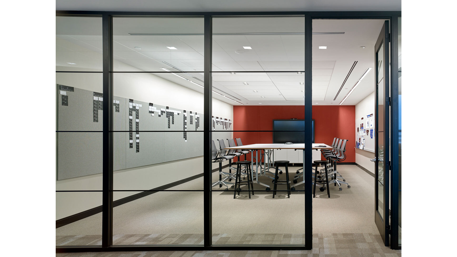 Common area: Meeting rooms with FINO walls, customized powder coat in vermillion, and 48” ladder pull.