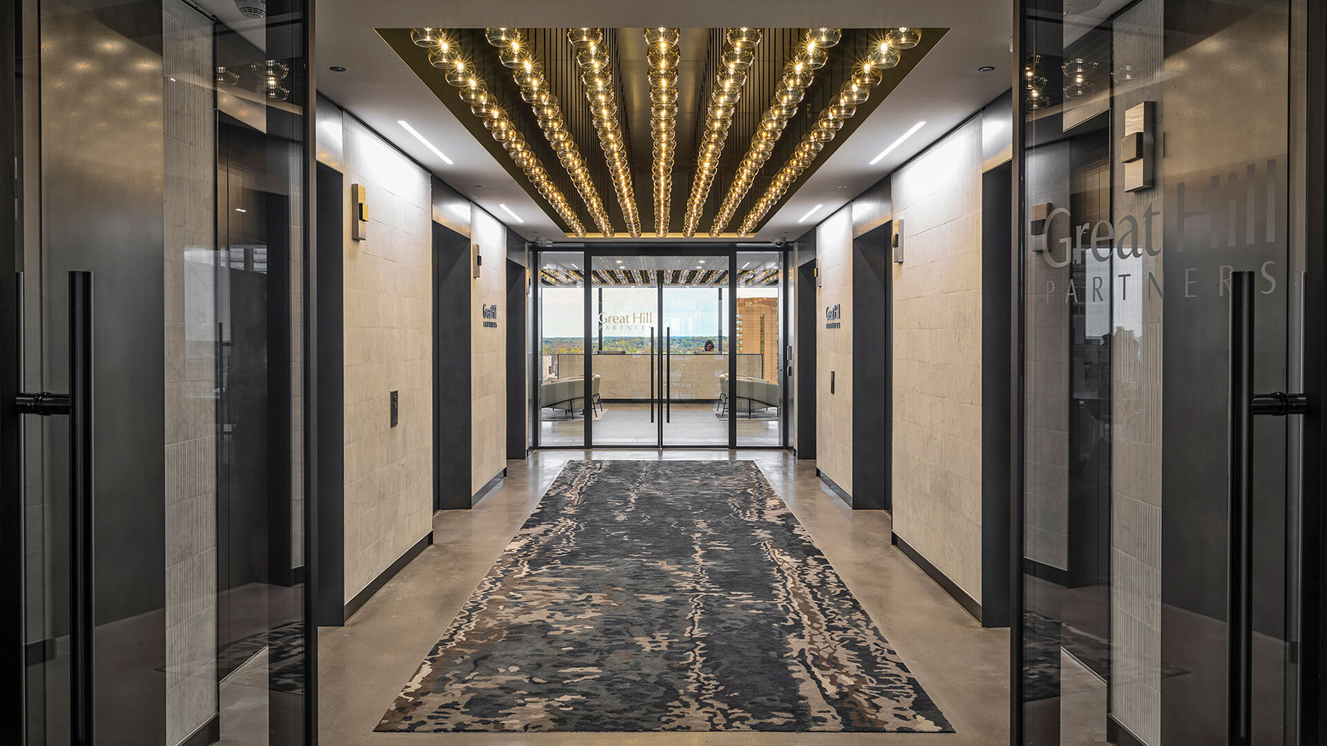 Corridor: QUADRO with medium bronze anodized finish, and doors with 84" ladder pulls.