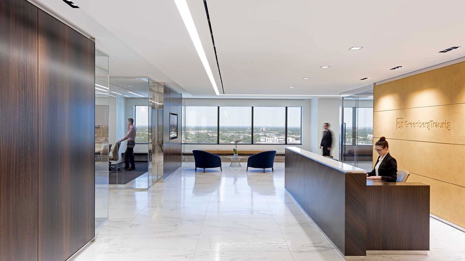A sleek and luxurious look for this major international law firm. MIMO's polished extrusions create a continuity with the marble floors and contribute to the bright and luminous space.