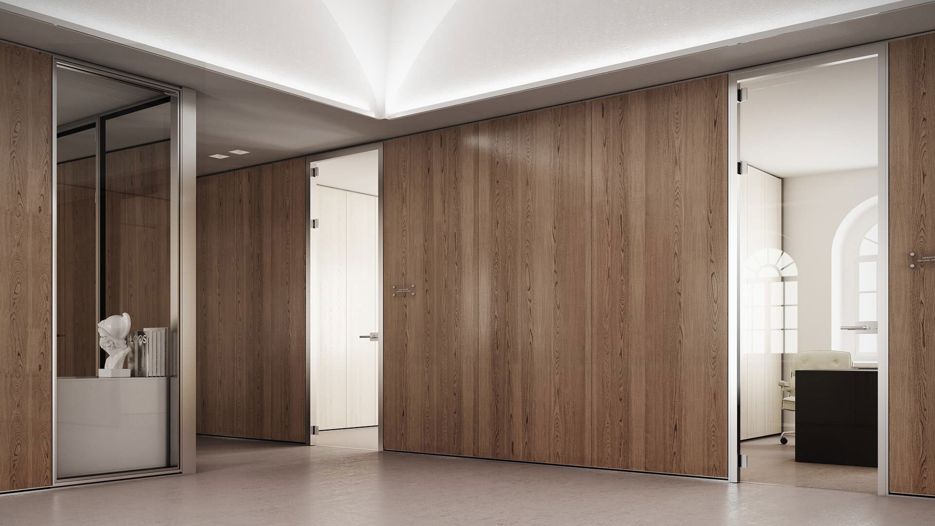 HALLWAY: Offices with QUADRO walls and sliding doors with ladder pulls, both in open and closed positions.