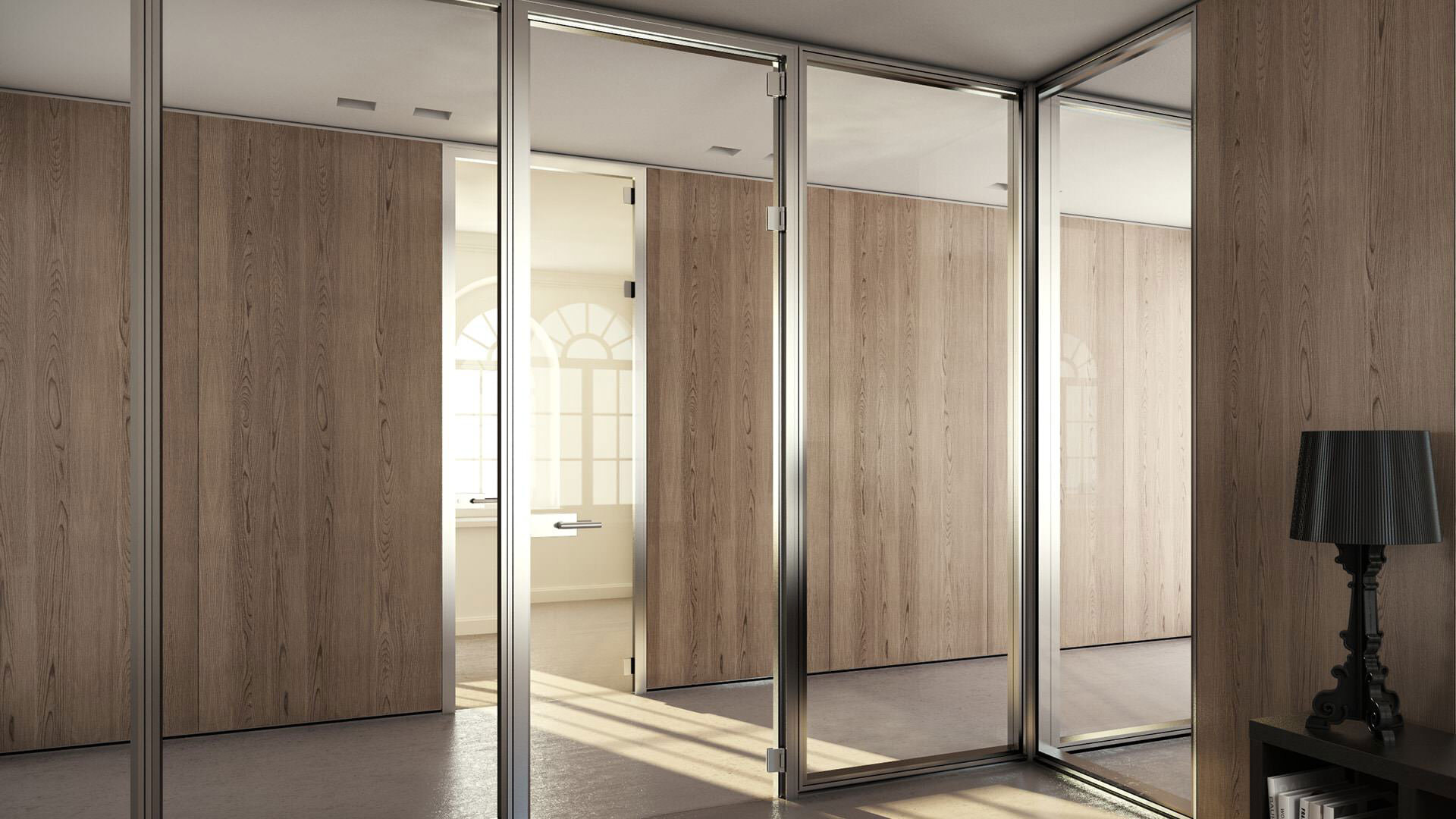 Entrance: Meeting room with MIMO walls with clear anodized finish and pivot doors.