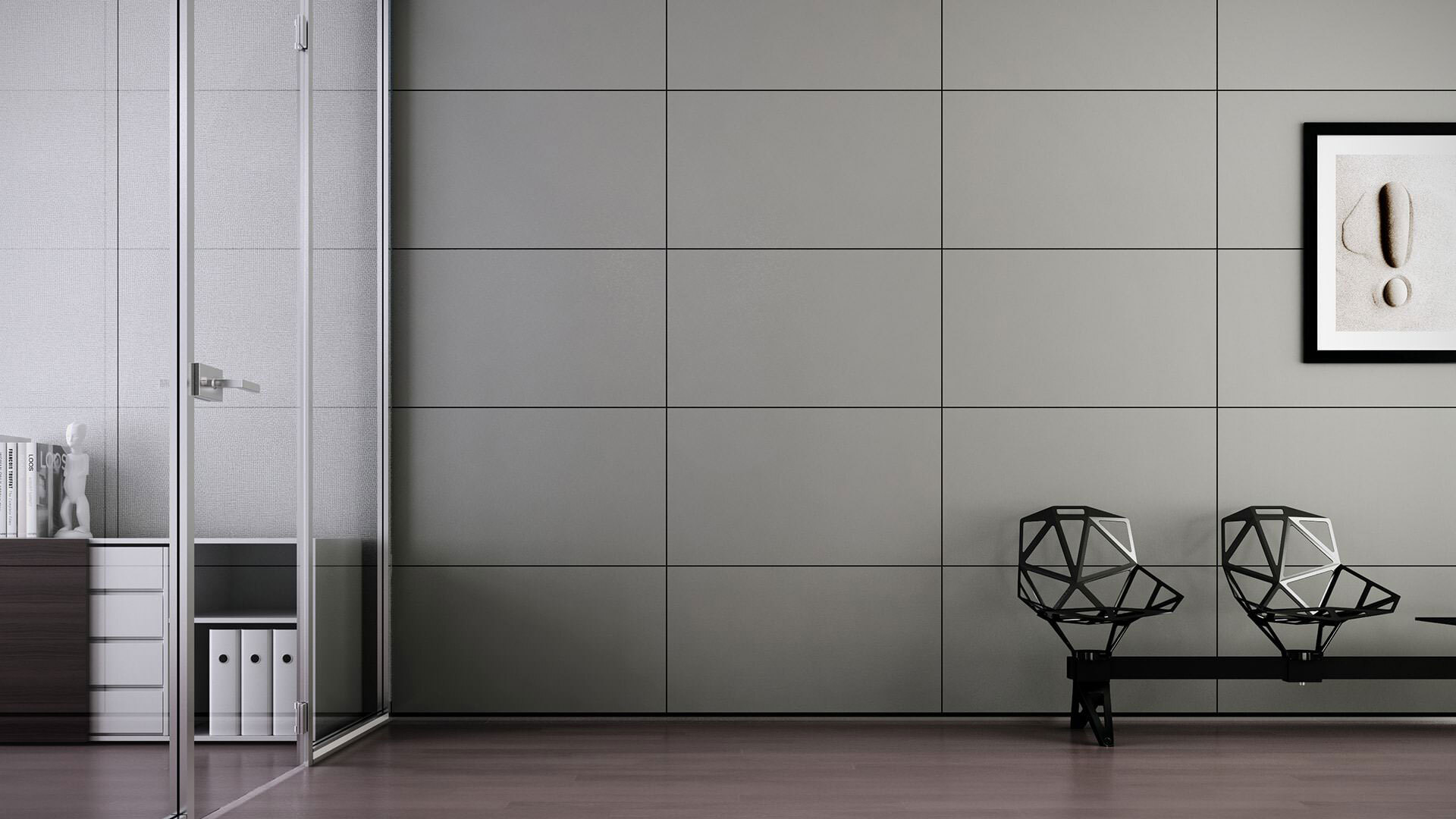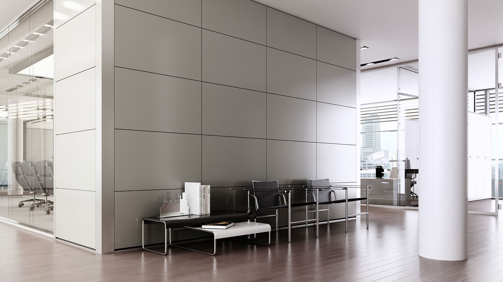 Office area: PLANIKA in gray steel skin, junction with glass wall system. (c) photo by Muraflex