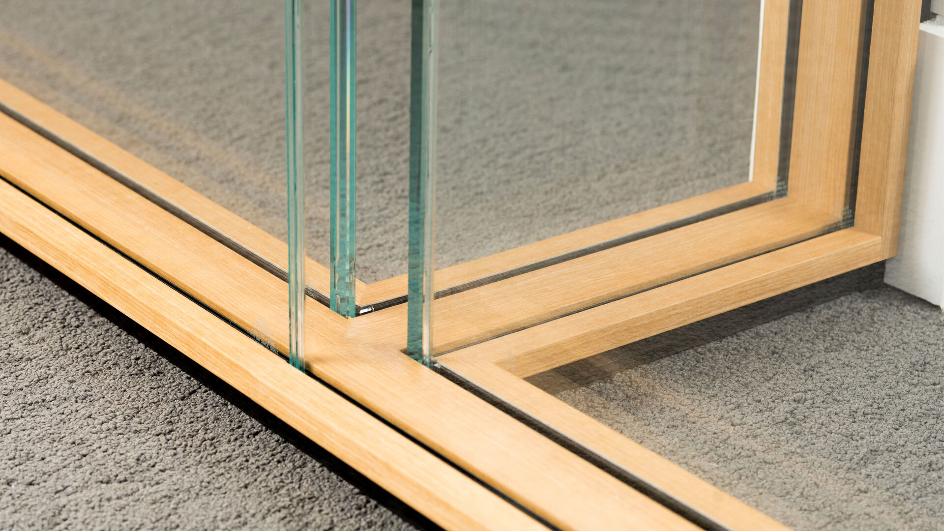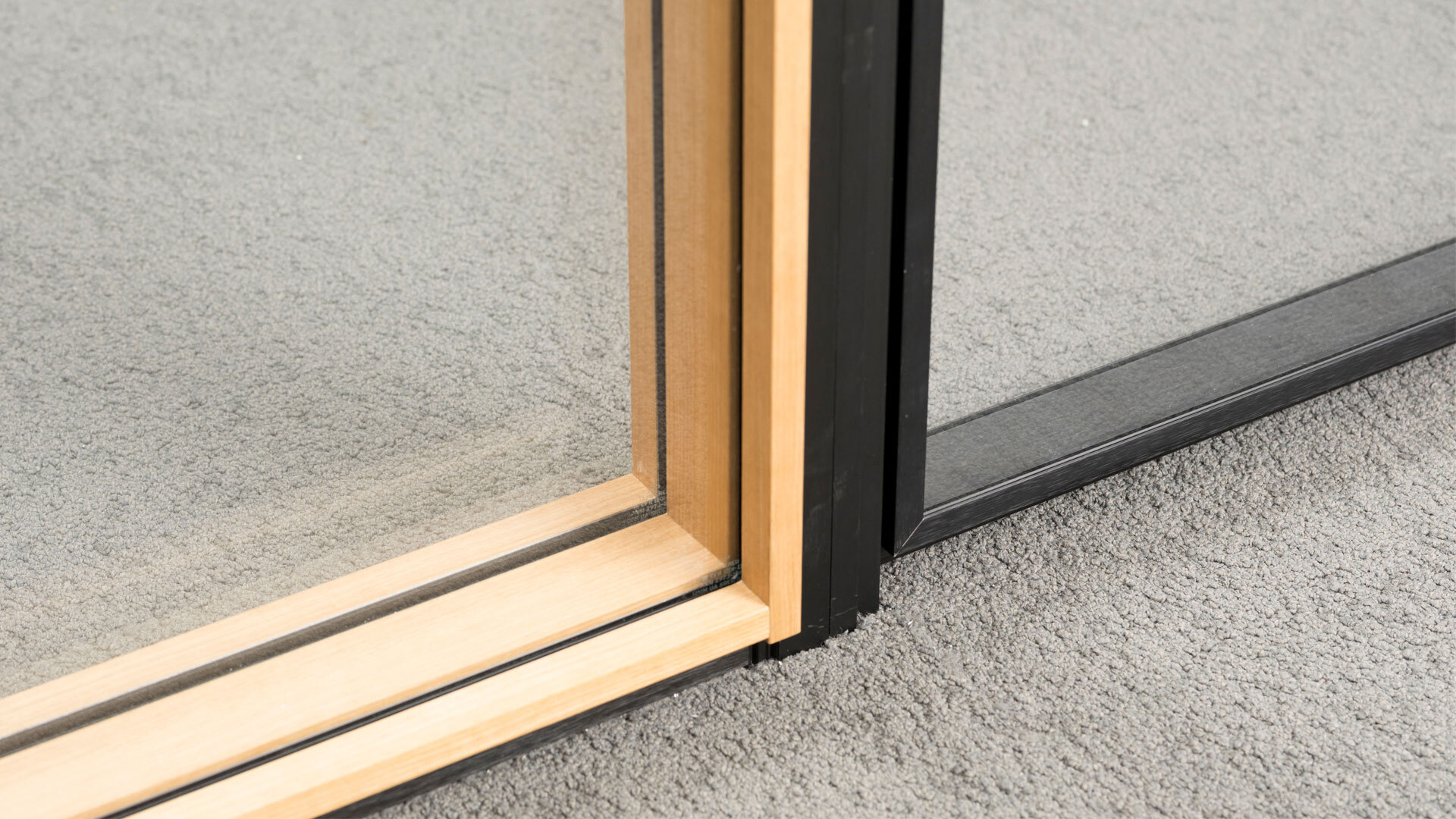 Wall - Door junction. Double Glazed. Brushed black anodized finish and light oak wood veneer snap-on trim. (c) photo by Jimmy Fishbein