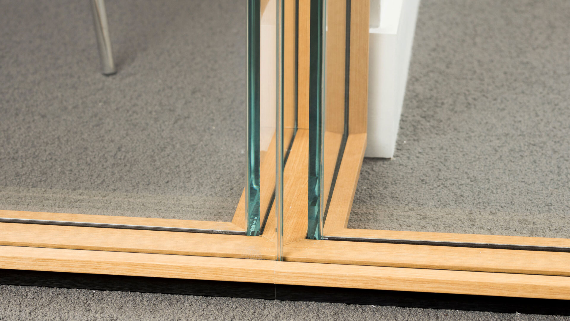 T-condition junction. Double Glazed. Brushed black anodized finish and light oak wood veneer snap-on trim. (c) photo by Jimmy Fishbein