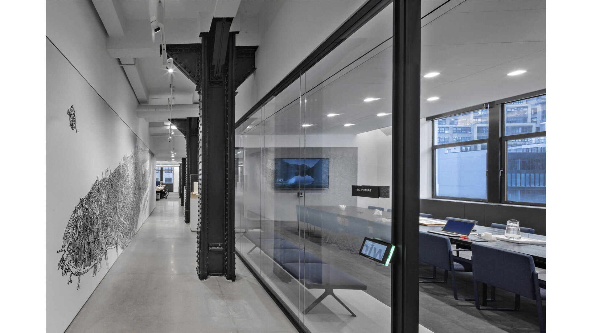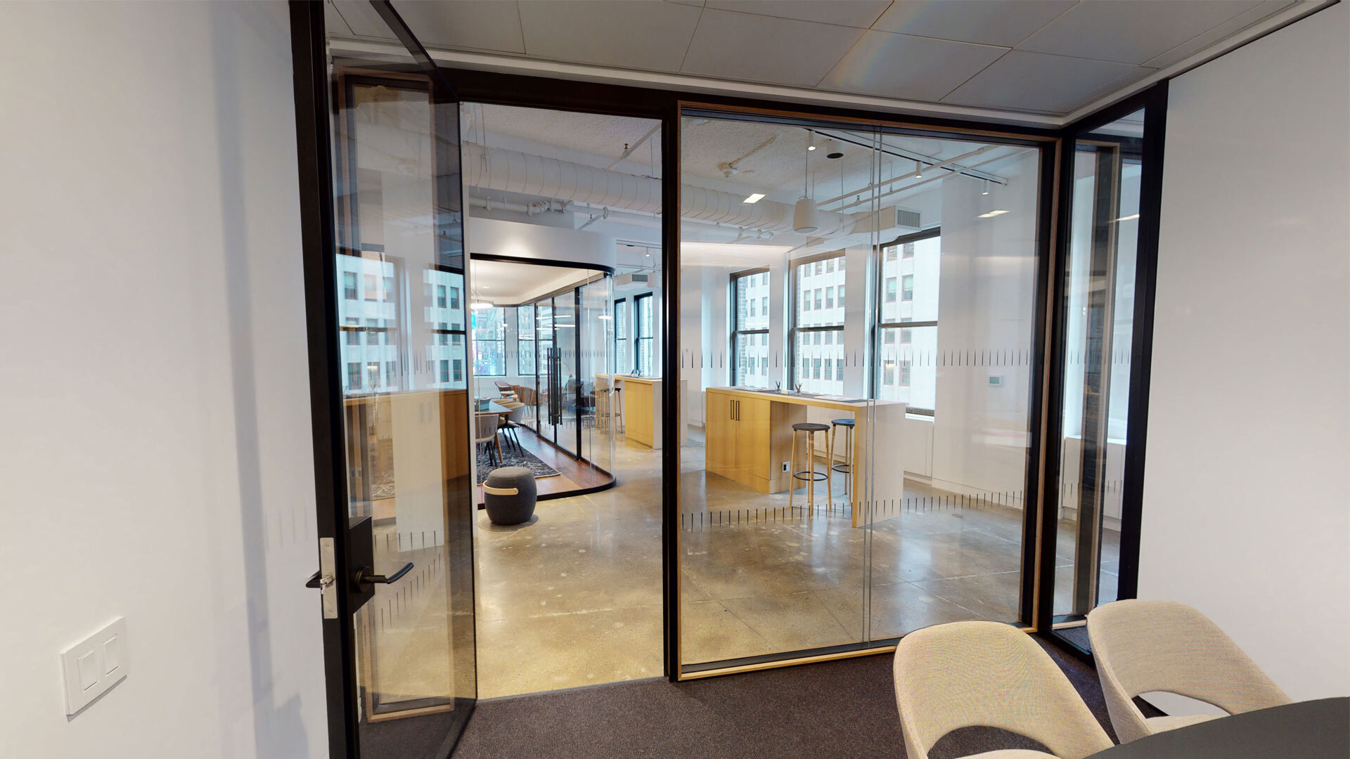 HALLWAY: Offices with QUADRO walls and sliding doors with ladder pulls, both in open and closed positions.