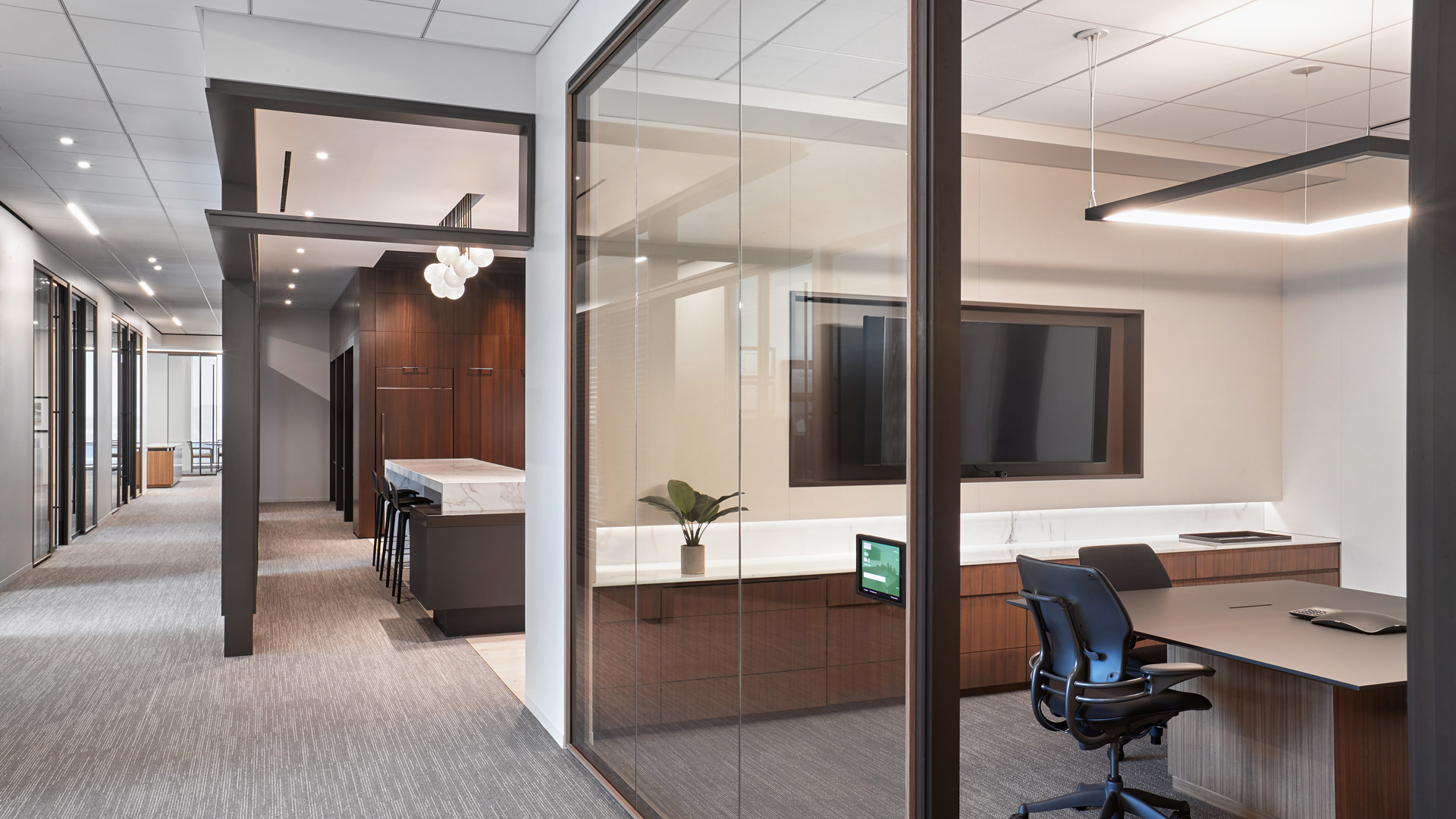 Offices : QUADRO with medium bronze anodized finish, walnut veneer trims, and sliding doors with 84” ladder pulls.