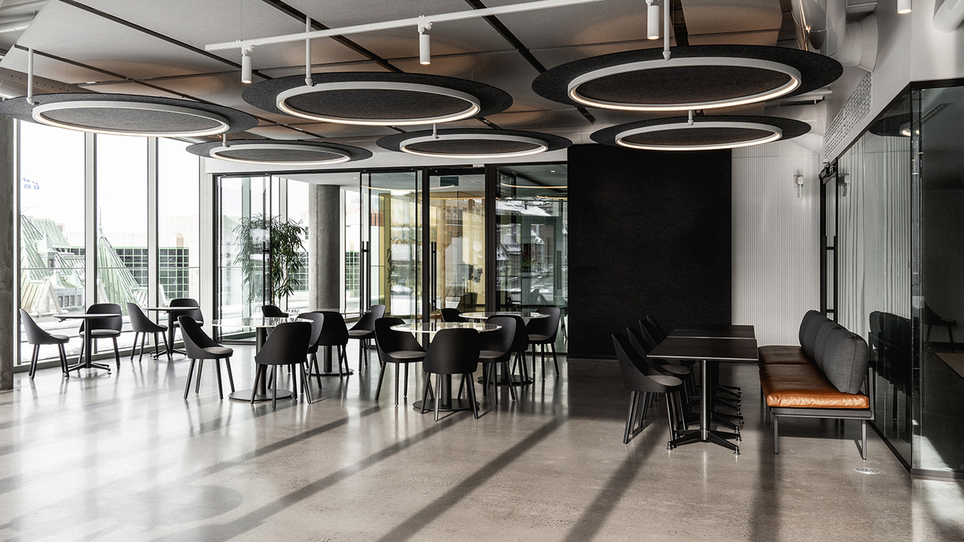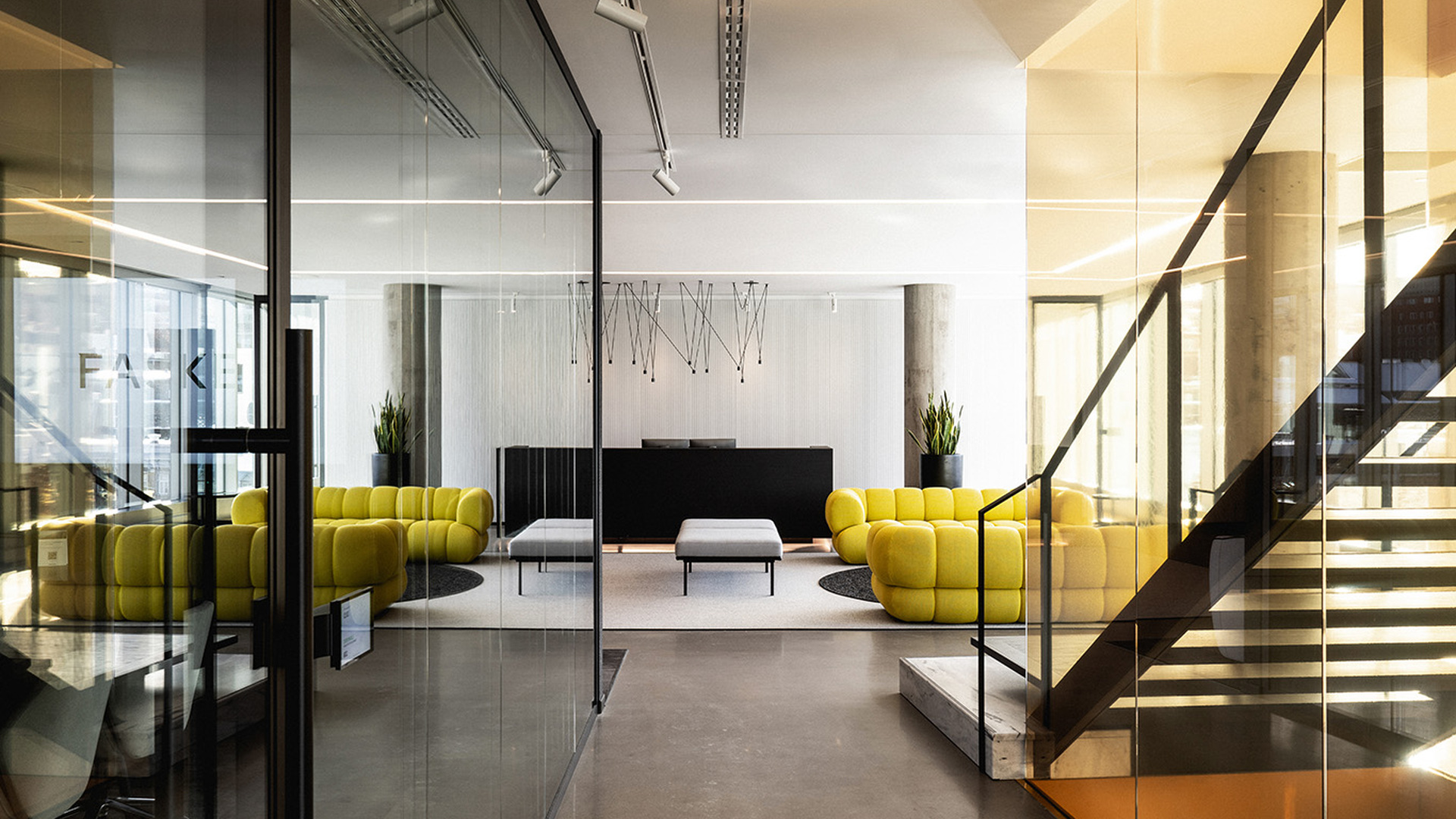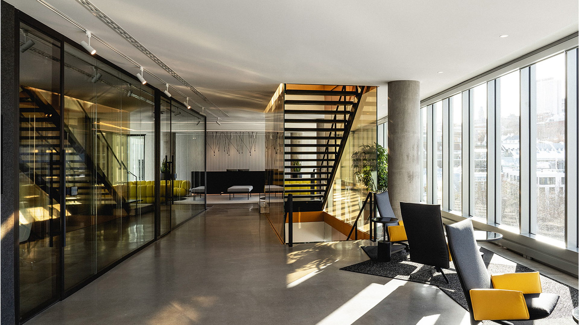 Les murs FINO en verre double constituent une excellente séparation acoustique entre la salle de conférence et l’espace commun, en plus de refléter avec élégance l’escalier qui monte. Le fini noir anodisé complète parfaitement toutes les teintes présentes, qu’il s’agisse d’un beige clair subtil ou d’une touche plus vive de jaune moutarde dans le mobilier de l’espace commun.
