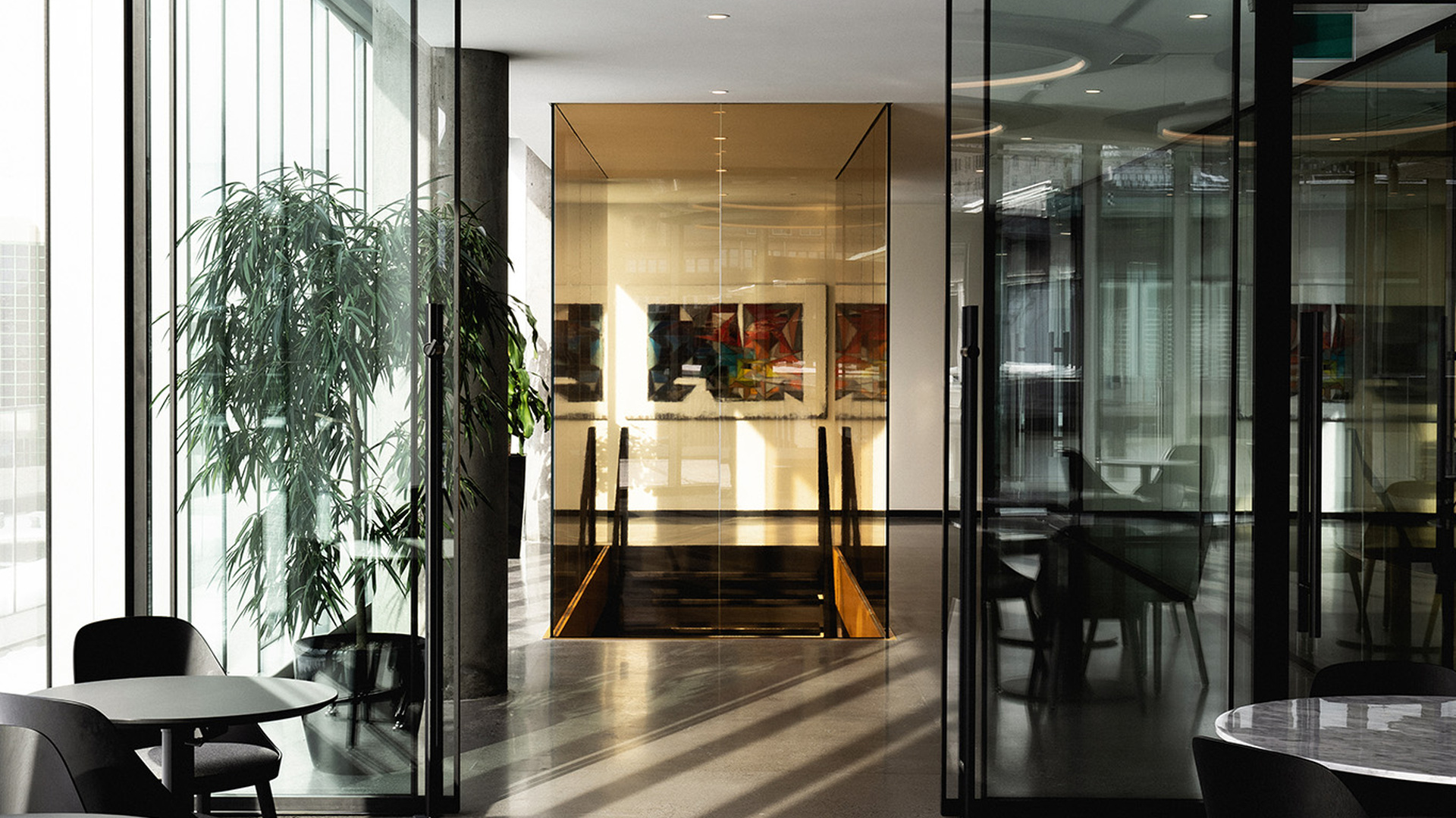 À l’étage, nous avons une meilleure idée de l’aspect lumineux. Si les tons sont plutôt monochromes, l’entrée du 7e étage présente un fort contraste de couleurs. Les deux murs FINO au fini anodisé noir s’harmonisent parfaitement avec le plancher réfléchissant, le mobilier et les plantes sélectionnées avec soin. Les poignées tubulaires rondes à verrou de 66 po sur les portes coulissantes à cadre FINO à l’entrée confèrent à cet espace une allure très élégante.