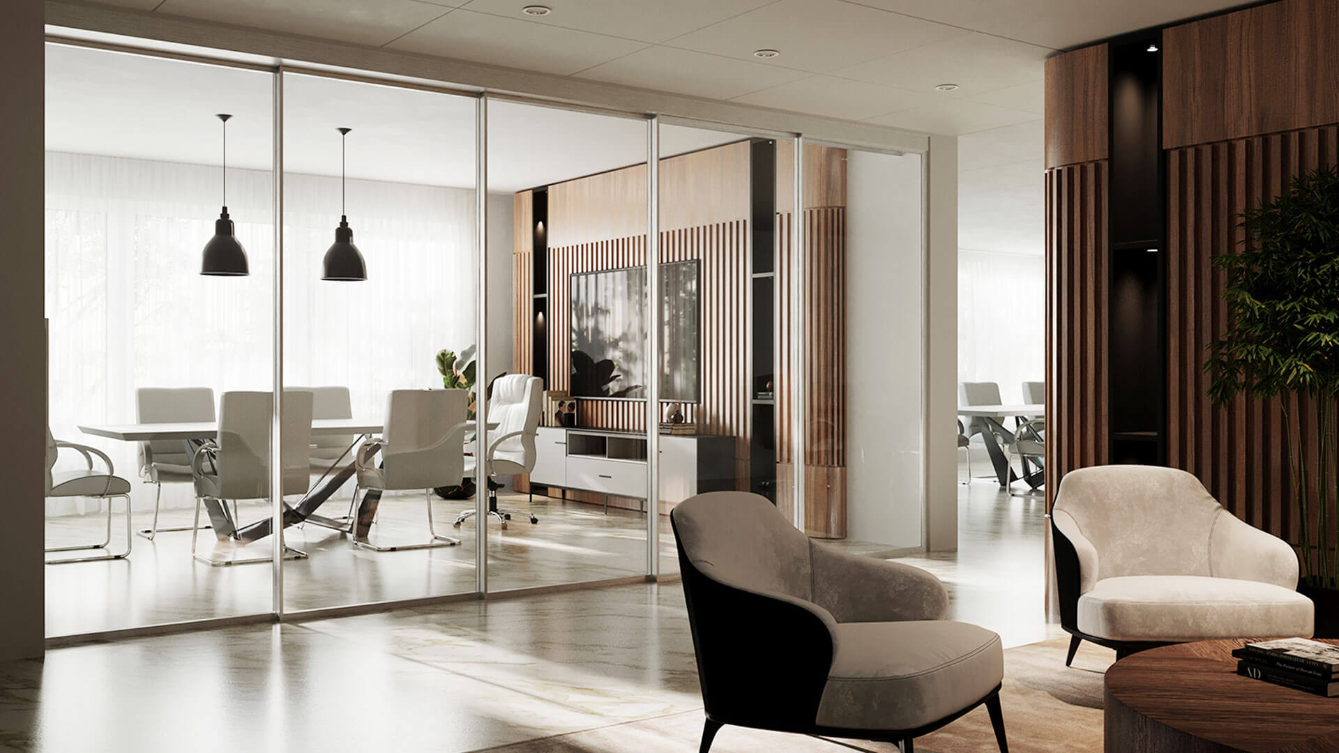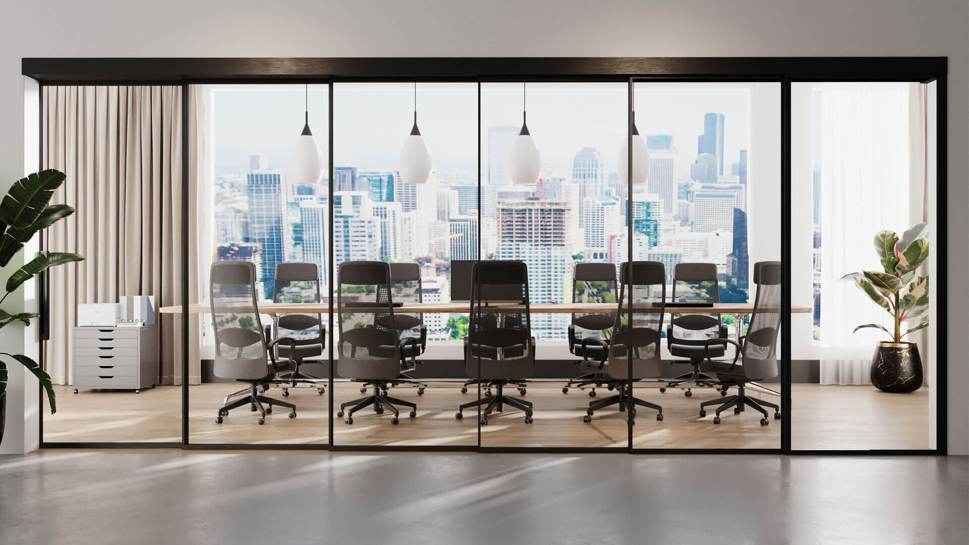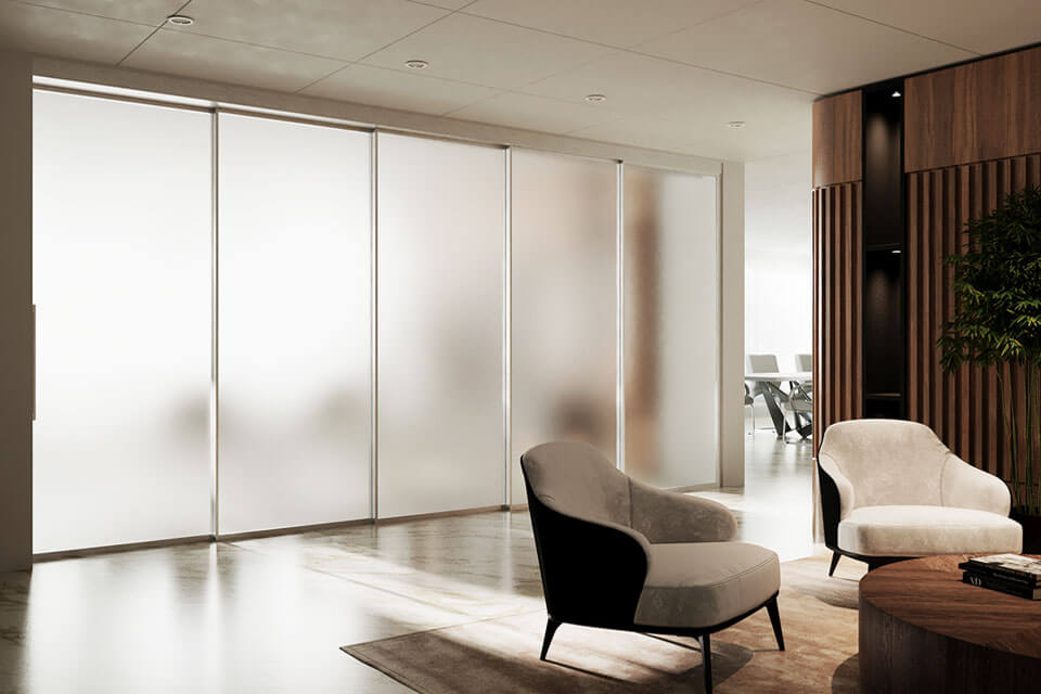Le système EXPO™ rend n’importe quel espace adaptable et dynamique en un seul clic, permettant de transformer instantanément un espace entièrement ouvert en une zone de réunion. Le système de portes coulissantes accueille des panneaux de verre à cadre simple ou double dotés de seuils tombants, pour une acoustique supérieure, un système de poulies synchronisées motorisées, pour un profil aligné à l’ouverture ou à la fermeture, une poignée intégrée et un look spectaculaire dans votre choix des finis Muraflex.